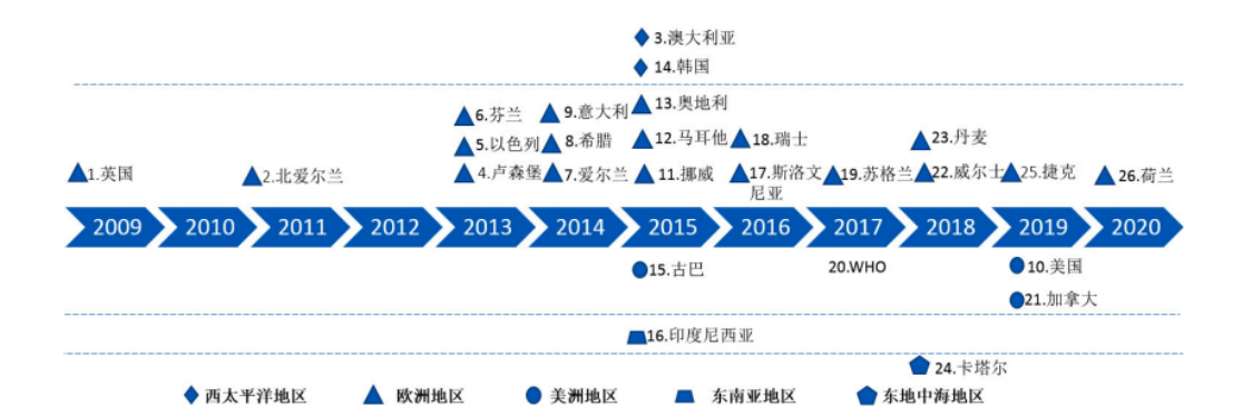 图 3 WHO 和 25 个国家(地区)的失智症行动计划发布时间[6]