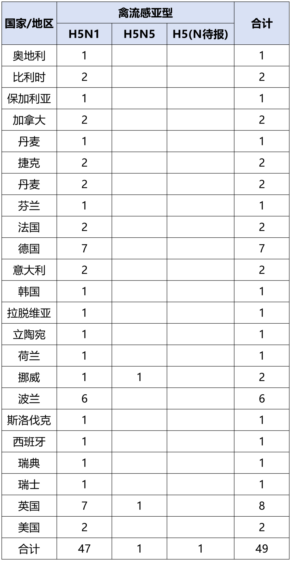 4、2025年11月23 - 29日,世界动物卫生组织共通报 49 起高致病性禽流感动物疫情事件。