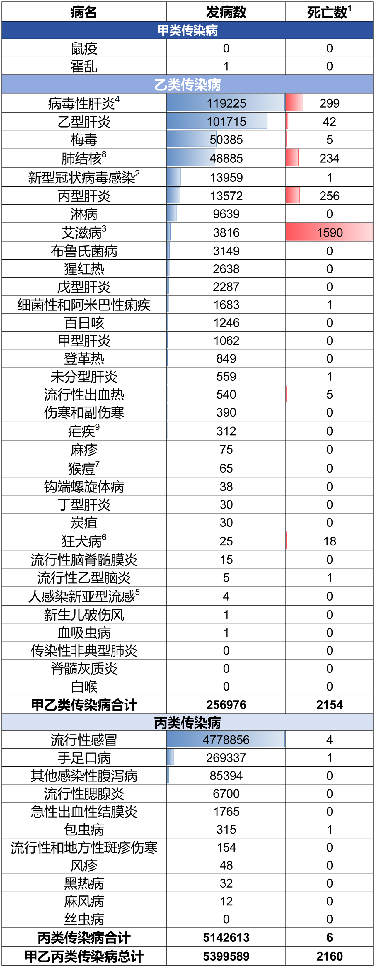 3、2025年11月(11月1日0时至11月30日24时),全国(不含香港、澳门特别行政区和台湾地区,下同)共报告法定传染病 5399589 例,死亡 2160 人。