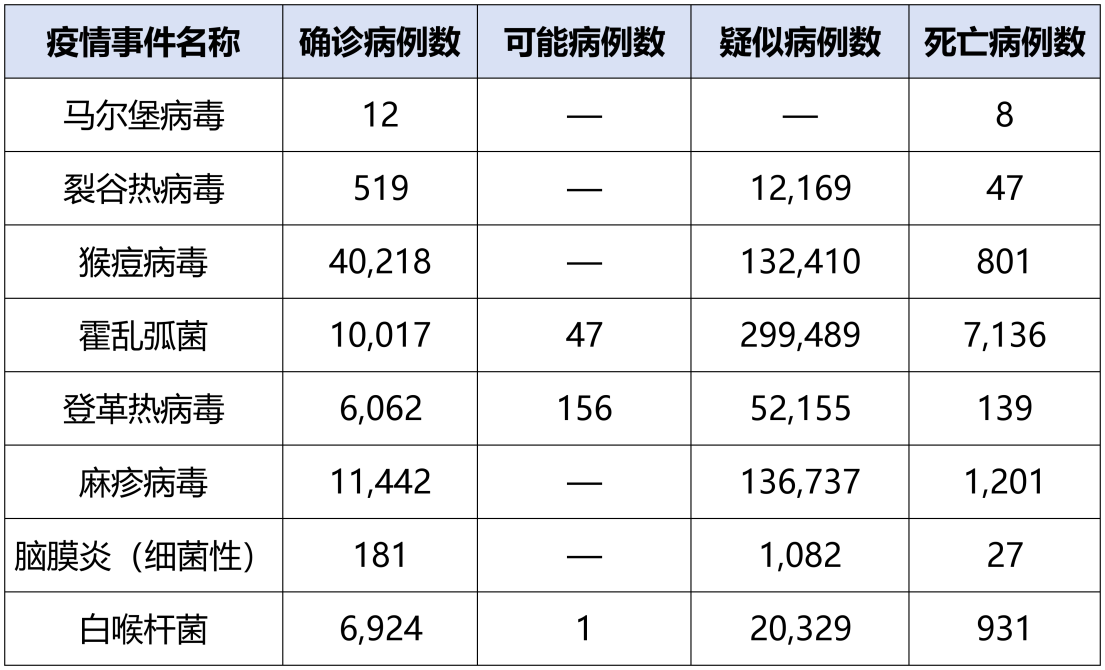 7、非洲猴痘、霍乱、登革热、麻疹、细菌性脑膜炎、裂谷热、白喉等疫情持续中。