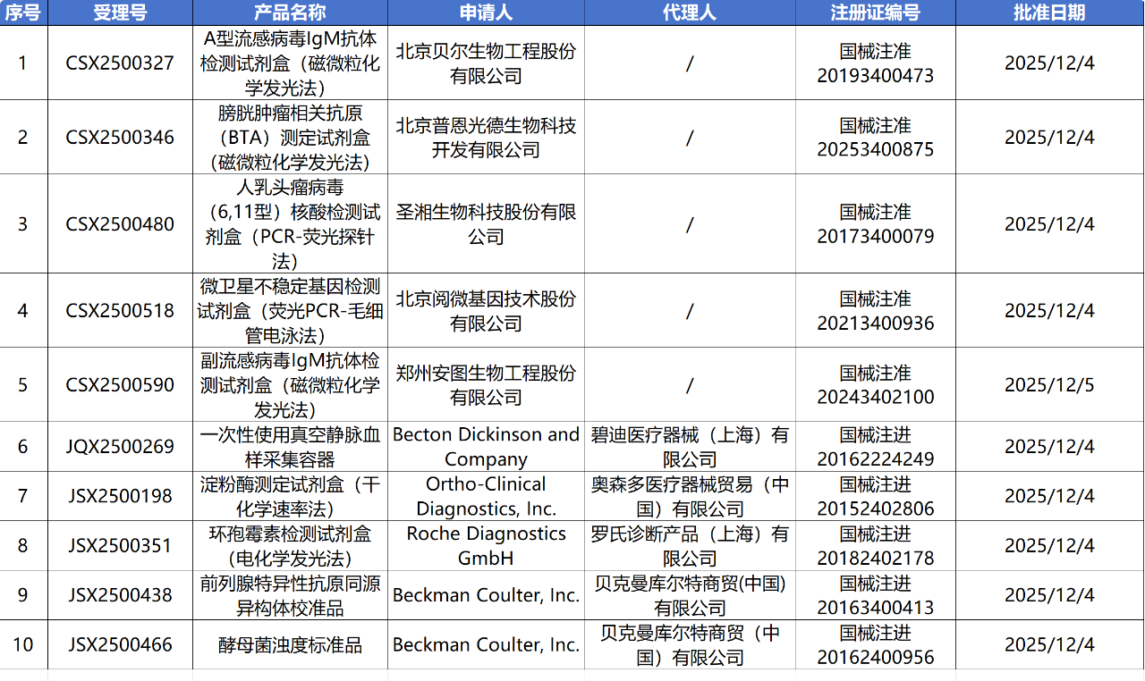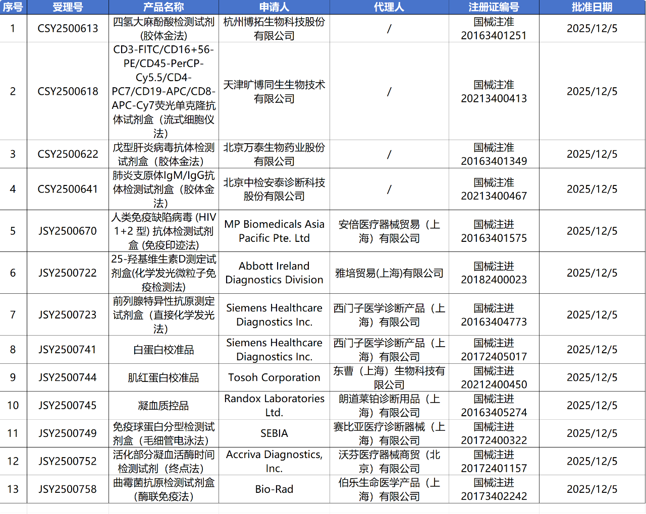 12月8日,国家药监局审批通过了40个医疗器械,其中有10款IVD产品变更注册,13款IVD产品延续注册。