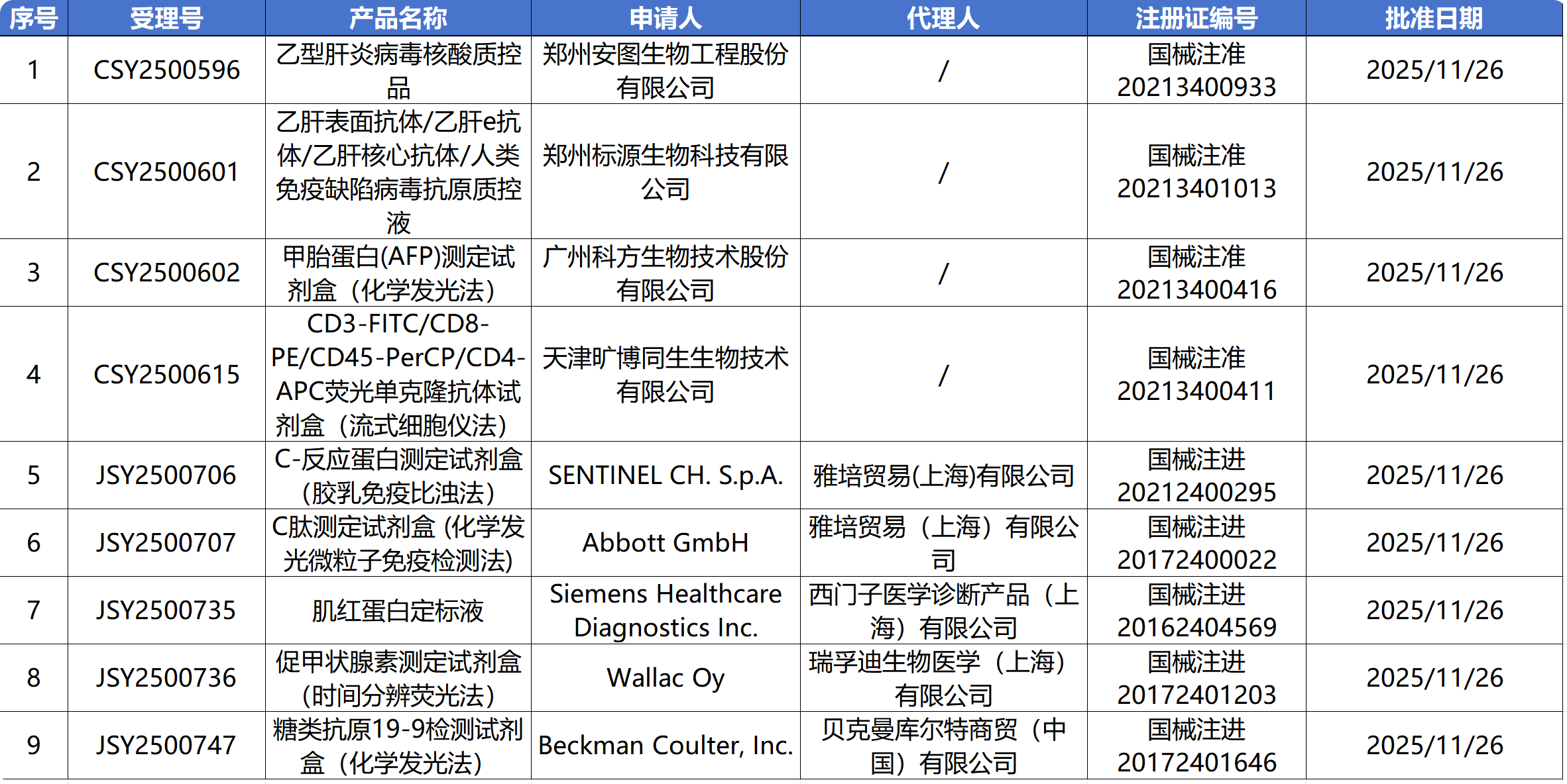 11月28日,国家药监局审批通过了76个医疗器械,其中有1款IVD产品变更注册,9款IVD产品延续注册。