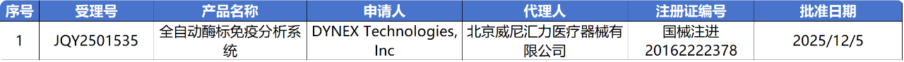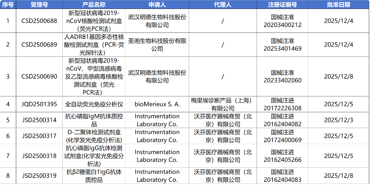 12月9日,国家药监局审批通过了109个医疗器械,其中有8个IVD产品变更注册,1款IVD产品延续注册。