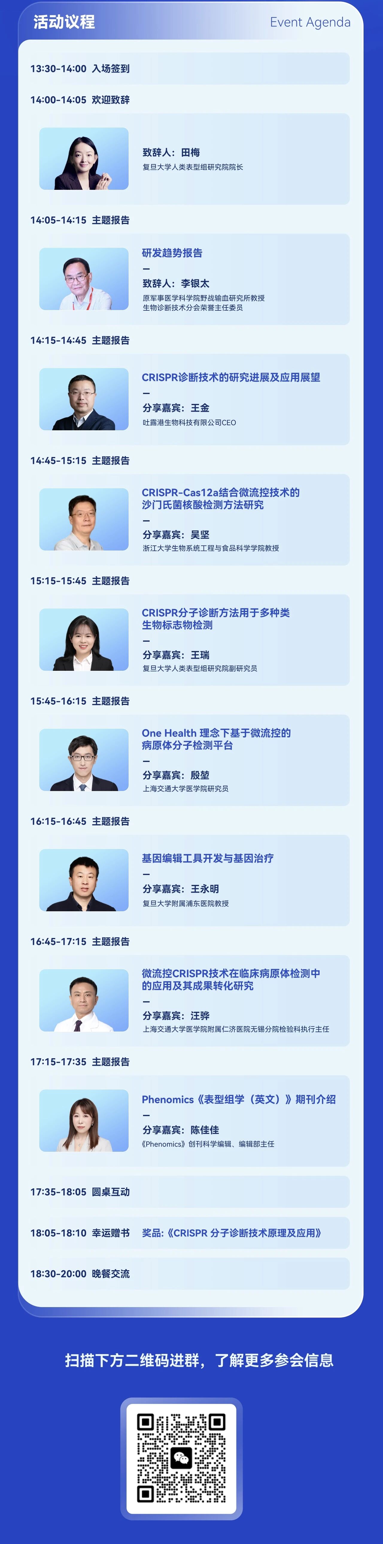 「生物诊断前沿技术专题会」是由中国医药生物技术协会生物诊断技术分会发起,致力于促进生物诊断领域“产、学、研、用”的交流合作,为创新成果转化提供知识分享和资源链接平台。自2025年6月启动以来,专题会围绕“CRISPR诊断技术创新与转化”已先后在北京与无锡顺利举办两期。北京专题会中,与会专家分享了从CRISPR诊断底层技术到应用探索的最新进展。同时深入探讨了创新产品从研发到上市面临的关键挑战。无锡专题会侧重探讨CRISPR诊断技术在免扩增核酸检测及非核酸检测领域应用的创新动态、存在问题及解决方案。这一北一南两场专题会,沿着从技术创新到场景落地的脉络逐步推进,汇聚了两地百余位关注CRISPR诊断技术的专业人士,为国内CRISPR诊断生态圈的建立打下了基础。第三期“CRISPR诊断技术创新与转化”专题会,将于12月21日在上海复旦大学举办!本期专题会邀请到复旦大学、上海交通大学、浙江大学及吐露港生物的5位CRISPR诊断领域的顶尖专家,将围绕CRISPR产品开发、生物传感及微流控技术平台展开,结合成功转化案例共同探讨CRISPR诊断技术创新与转化之路。同时,专题会将首次关注CRISPR基因编辑与基因治疗技术,展现CRISPR技术在诊疗两大场景中的广阔应用。会议现场福利!您将有机会免费获取由生物诊断技术分会组织编写的国内首部《CRISPR分子诊断技术原理及应用》专著,同时现场还会有由复旦大学主办的《Phenomics》 期刊发放。会议时间:2025年12月21日 下午13:30 ~ 20:00