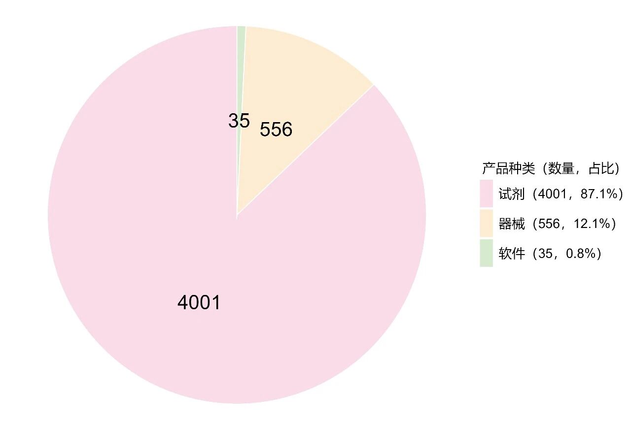 按产品类型细分,IVD试剂4001款,器械556款,体外诊断软件35款。(图2)