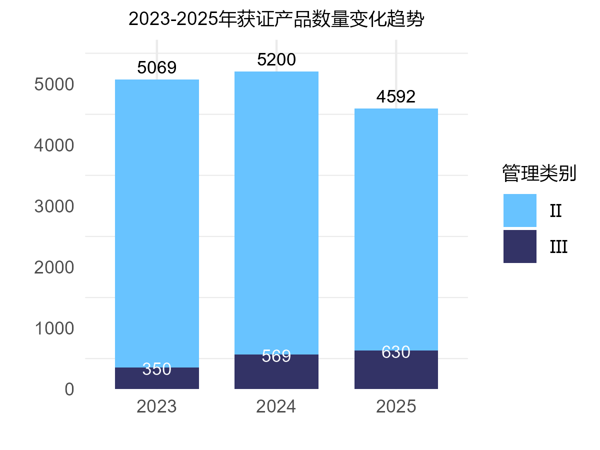 从时间趋势看,2025年获批的产品数量与2023和2024年相比显著减少,Ⅲ类产品数量显著增加。(图5)
