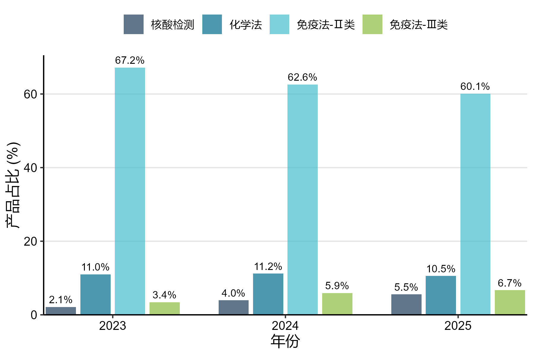 图6 2023-2025不同检测方法学产品占比变化趋势