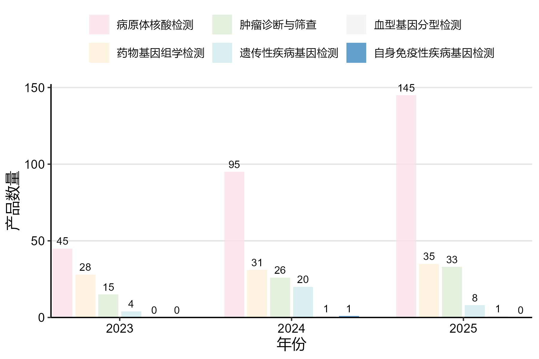 图12 2023-2025年分子检测不同领域产品数量变化趋势