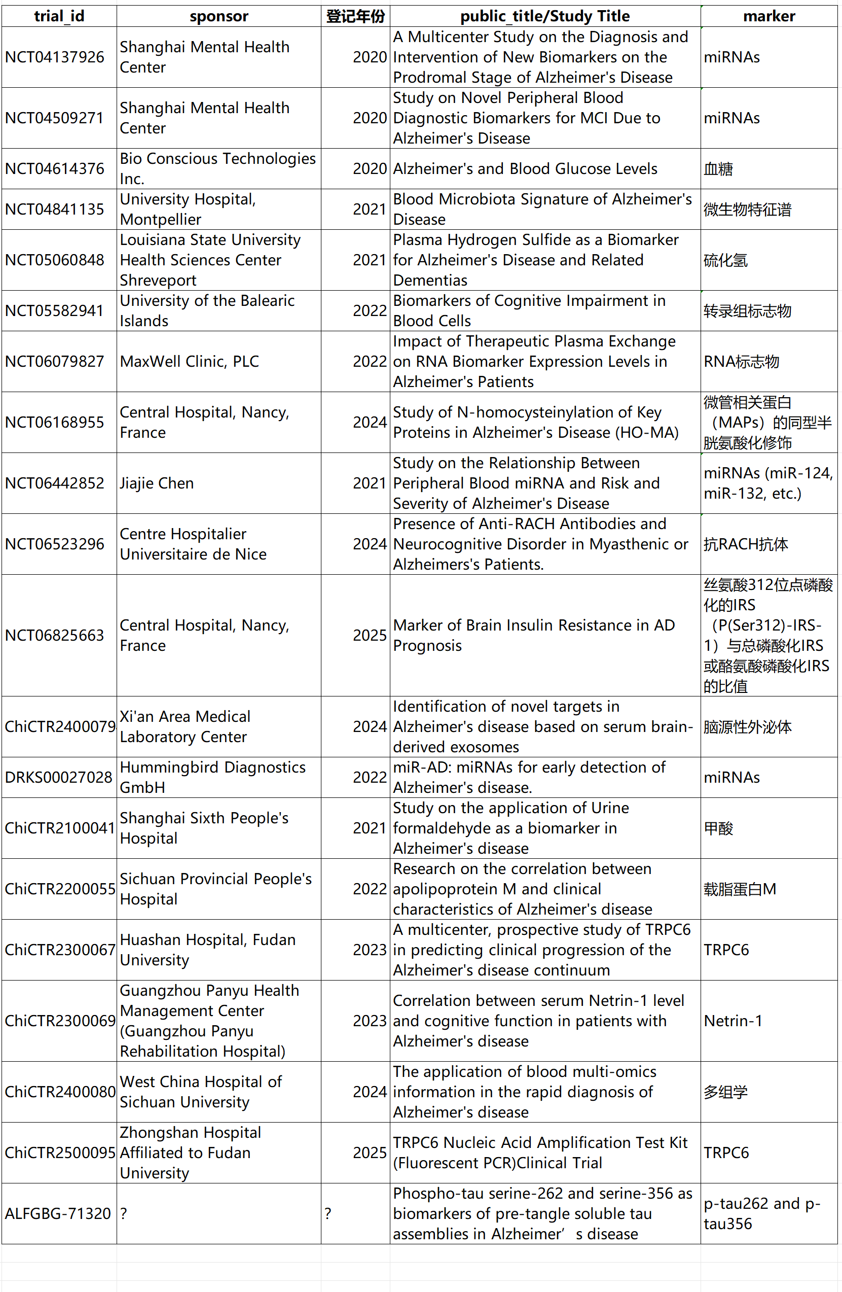检索ClinicalTrials, WHO ICTRP及中国临床试验注册中心,获取2020年至今开展的AD标志物检测临床试验,排除已被临床指南推荐的标志物(包括:Aβ42, Aβ40, p-tau217, p-tau181, p-tau231, MTBR-tau243, NfL, GFAP, α突触核蛋白等),排除影像学方法相关临床试验,剩余临床试验用于本次分析。(检索过程中难免有遗漏,仅供参考)