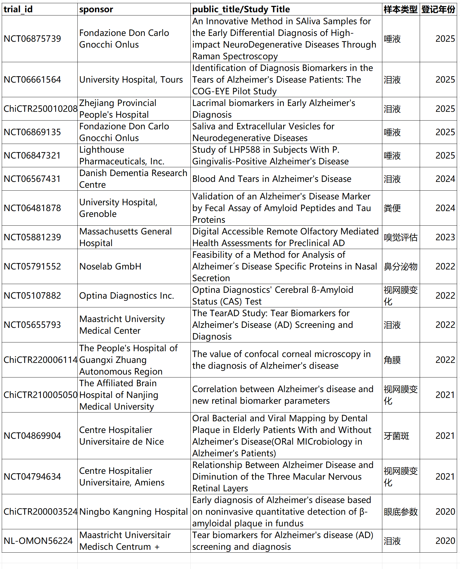 附录一 新样本类型进行AD检测的临床试验信息(2020-2025)
