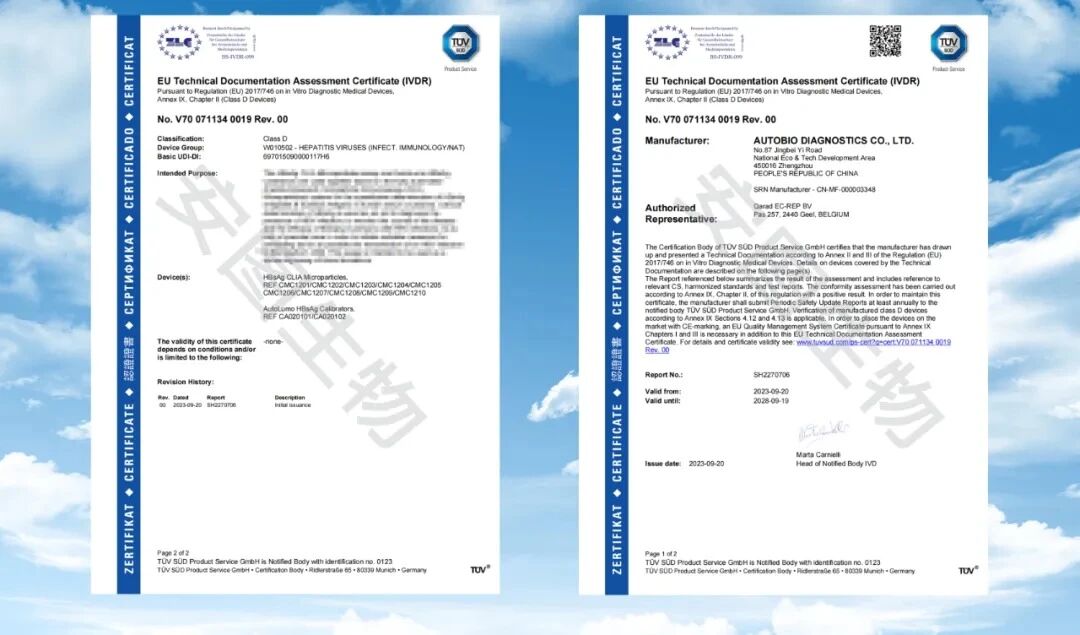 在欧盟最高等级认证的赛道上,安图生物实现了“三连突破”:2020年,HCV抗体试剂获CE认证,灵敏度达100%、特异性 99.86%;2021年,HIV Ag/Ab试剂再获CE认证,两项关键指标同样跻身顶级水平;2023年,HBsAg试剂斩获欧盟CE IVDR Class D认证——这是新法规下的最高级别认证,也是国内首张该类证书,其灵敏度与特异性双双达到100%。