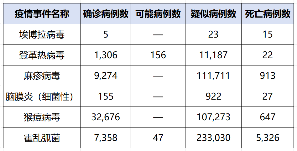 4、非洲猴痘、霍乱、登革热、麻疹、细菌性脑膜炎、埃博拉病毒病等疫情持续中。