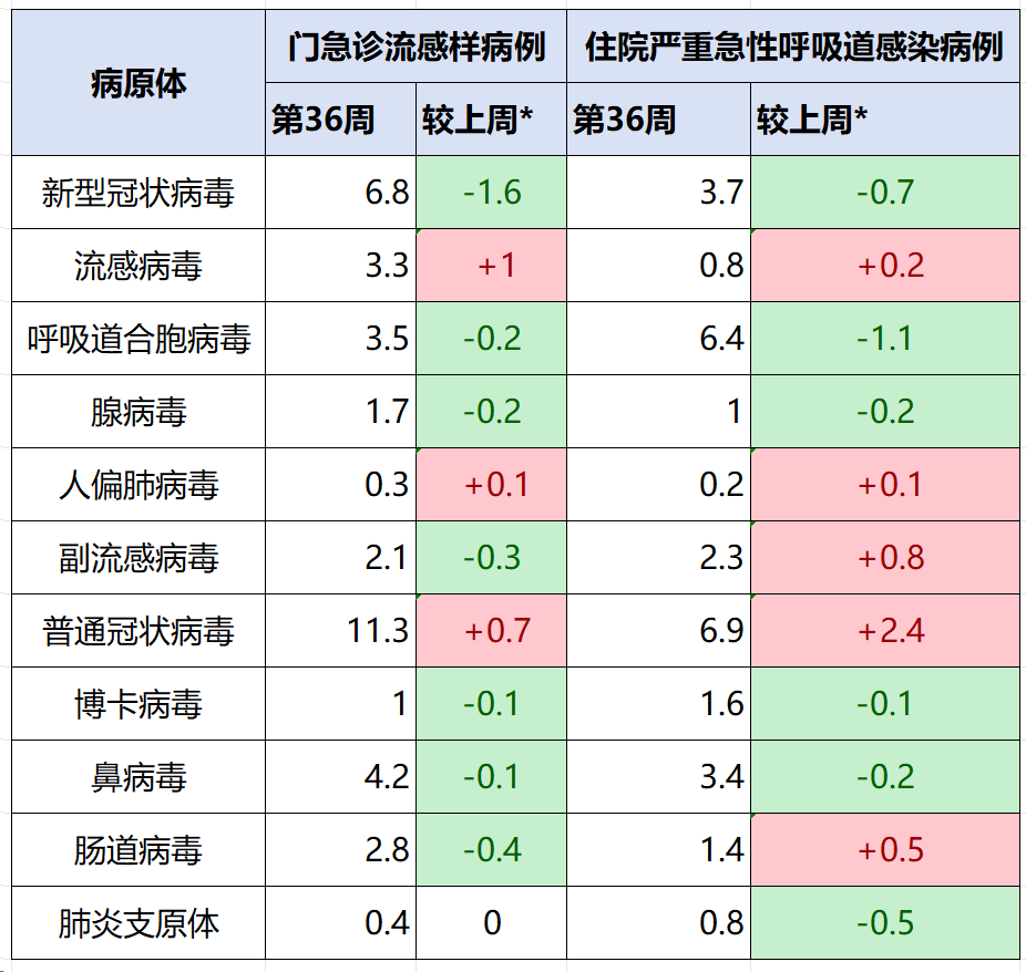 2、 36周,呼吸道传染病疫情总体处于较低水平。新型冠状病毒、呼吸道合胞病毒、普通冠状病毒等存在一定水平活动。