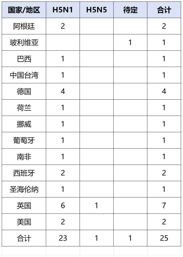 2、2025年8月31日 - 9月6日,世界动物卫生组织共通报25起高致病性禽流感动物疫情事件。