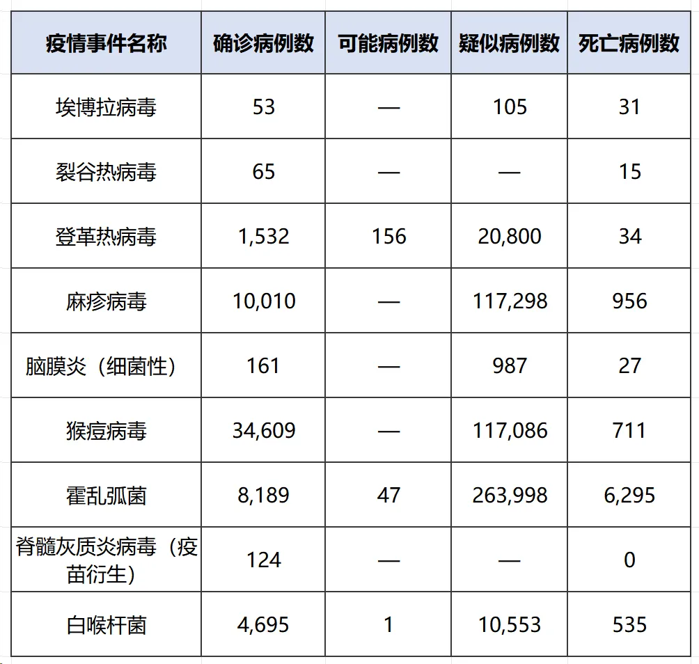 5、非洲猴痘、霍乱、登革热、麻疹、细菌性脑膜炎、裂谷热、埃博拉、白喉等疫情持续中。