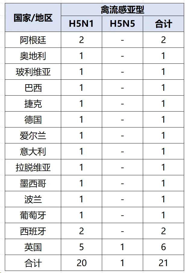 4、2025年9月28日 - 10月4日,世界动物卫生组织共通报 21 起高致病性禽流感动物疫情事件。