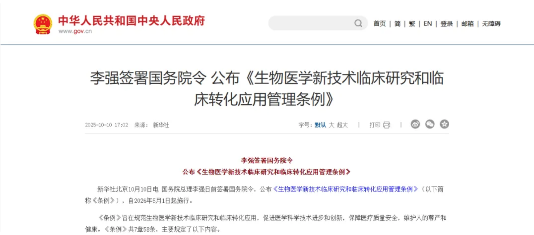 国务院于2025年10月发布《生物医学新技术临床研究和临床转化应用管理条例》,自2026年5月1日起施行。该条例旨在规范生物医学新技术的临床研究与转化应用,推动科技创新,保障医疗安全与质量。主要内容包括:明确适用范围为境内相关活动,坚持人民健康为中心、安全与发展并重的基本原则;规定临床研究须由法人单位发起,三级甲等医疗机构实施,并在国家卫生健康部门备案;强调研究过程中需履行知情同意、禁止收费、风险管控及方案变更审查机制;临床转化应用须经国务院卫生健康部门审批,特殊情况可紧急应用;加强监督管理,县级以上卫生健康部门负责监督检查,对违规行为依法处罚;明确未合规操作将承担行政或刑事责任;已开展项目须在条例生效后一个月内完成备案,药品和医疗器械试验另依专门法规执行。该条例构建了系统化、法治化的监管框架,促进生物医学技术健康发展,保障公众权益。