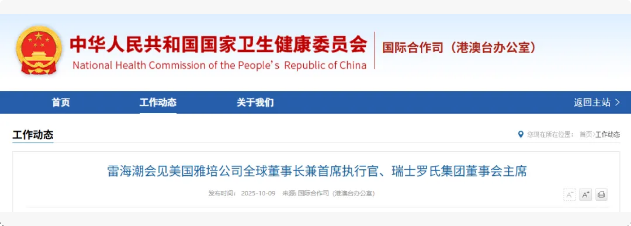 10月9日,国家卫生健康委主任雷海潮在北京分别会见了美国雅培公司全球董事长兼首席执行官罗赋德和瑞士罗氏集团董事会主席施万。会谈中,雷海潮介绍了中国“十四五”时期卫生健康领域取得的显著成就,强调将继续实施健康优先发展战略,着力提升服务能力、可及性和公平性,不断提高人民群众健康水平。他指出,即将召开的中国共产党二十届四中全会将为中外企业创造更多发展机遇,并欢迎雅培和罗氏集团加大在华投资与研发创新,共同培育新技术和优质产品,推动构建人类卫生健康共同体。罗赋德和施万高度评价中国卫生健康事业发展,表示高度重视中国市场,愿积极参与健康中国建设,助力中国及全球卫生健康发展。