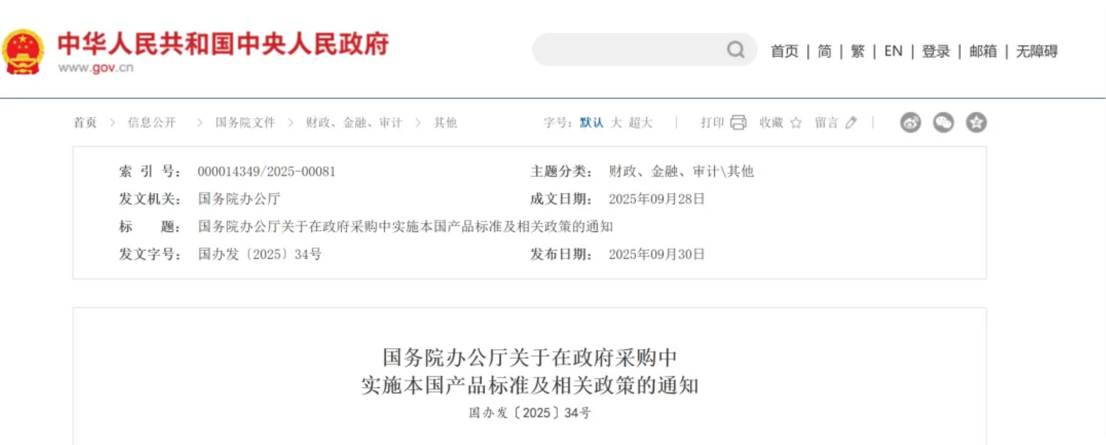 国务院办公厅发布《关于在政府采购中实施本国产品标准及相关政策的通知》,自2026年1月1日起施行。《通知》明确本国产品为中国境内生产且境内组件成本达规定比例的产品,特定产品还需关键组件和工序在境内完成;适用于货物及服务项目中的货物,不包括房屋、构筑物等。政府采购对本国产品给予20%价格评审优惠,若本国产品成本占比超80%,全部报价享受同等扣除。财政部将联合行业主管部门在5年内分类制定具体标准,并设3-5年过渡期。各类企业无论所有制形式均平等享受政策支持,不得差别或歧视对待。财政部门负责争议处理,必要时由相关部门或机构核实,并明确产品产地认定原则和证明要求。政策旨在营造开放、公平的政府采购环境,推动国内产业发展。