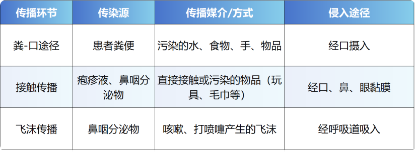 粪-口途径是本病最经典和主要的传播方式,病毒在感染者肠道内复制后随粪便排出,可长时间存活于环境中,易感儿童通过接触被污染的水源、食物、手或物品(如玩具、门把手)后经口摄入而感染;