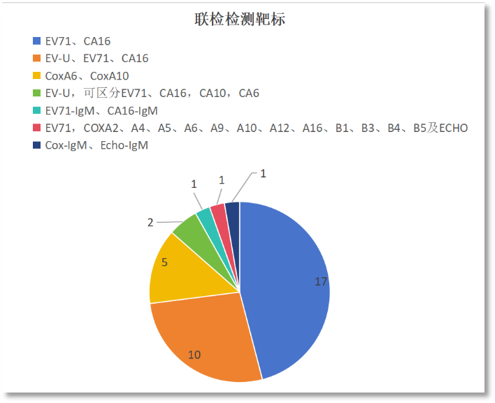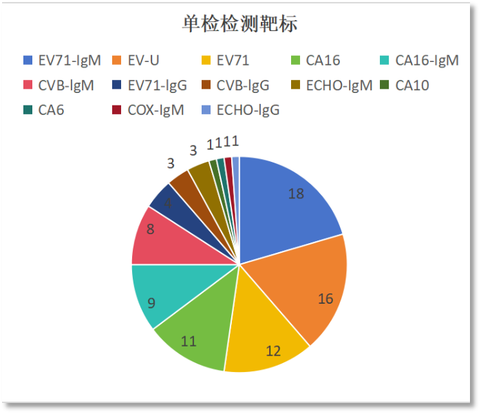 从检测靶标上看,主要还是以检测肠道病毒71型、柯萨奇病毒A16型的核酸和抗体为主,有6款产品是检测柯萨奇病毒A6型,其中有5款是同时检测柯萨奇病毒A6/A10。其他检测的病原体还有埃可病毒。