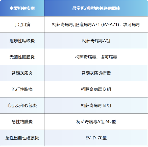 肠道病毒家族的致病性呈现出高度的复杂多样性,其核心特征在于病原体与临床表现之间存在着非线性的交叉网络关系。一方面,同一种临床综合征可由多种不同血清型的肠道病毒引发,另一方面,同一种病毒又可导致多种不同的疾病谱。下面是肠道病毒所致的部分疾病: