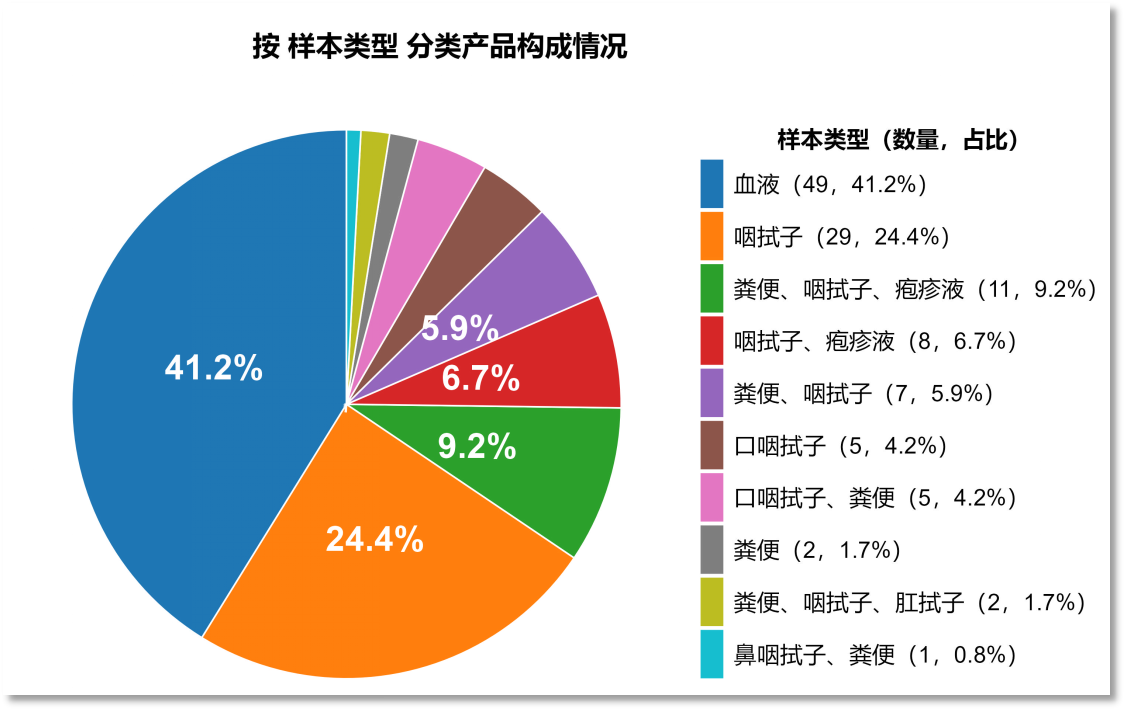 从样本类型上看,覆盖血液、咽拭子、粪便、疱疹液、肛拭子,主要是以咽拭子和粪便为主。其中49款血液产品均为免疫检测产品。