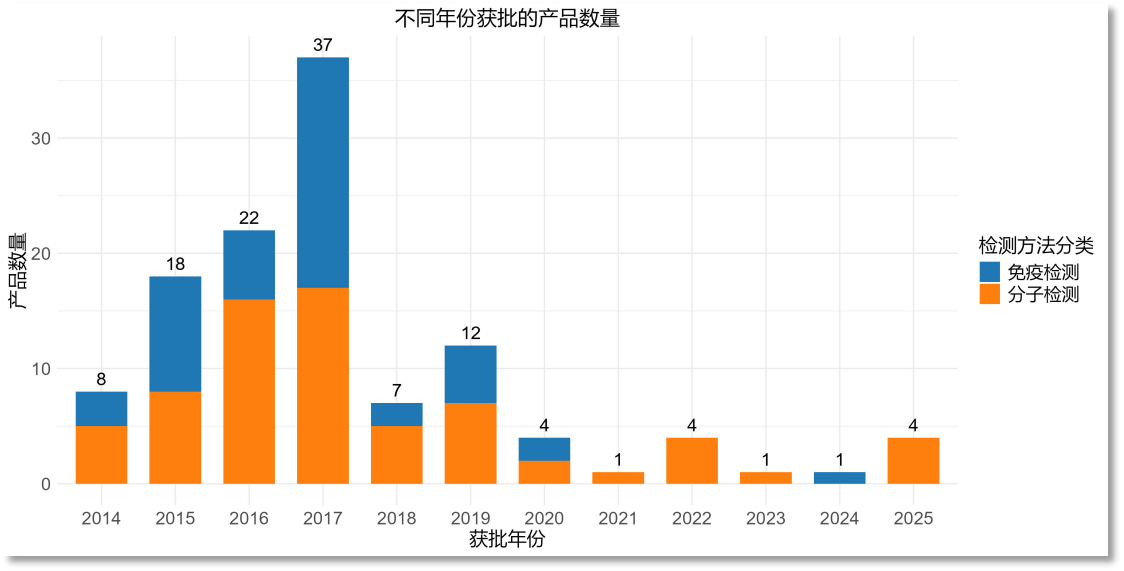 从时间趋势上看,2014年-2017年逐年递增,之后突然大幅减少,近5年每年的试剂盒注册数量基本不超过5个,且获批的产品以分子诊断产品为主。