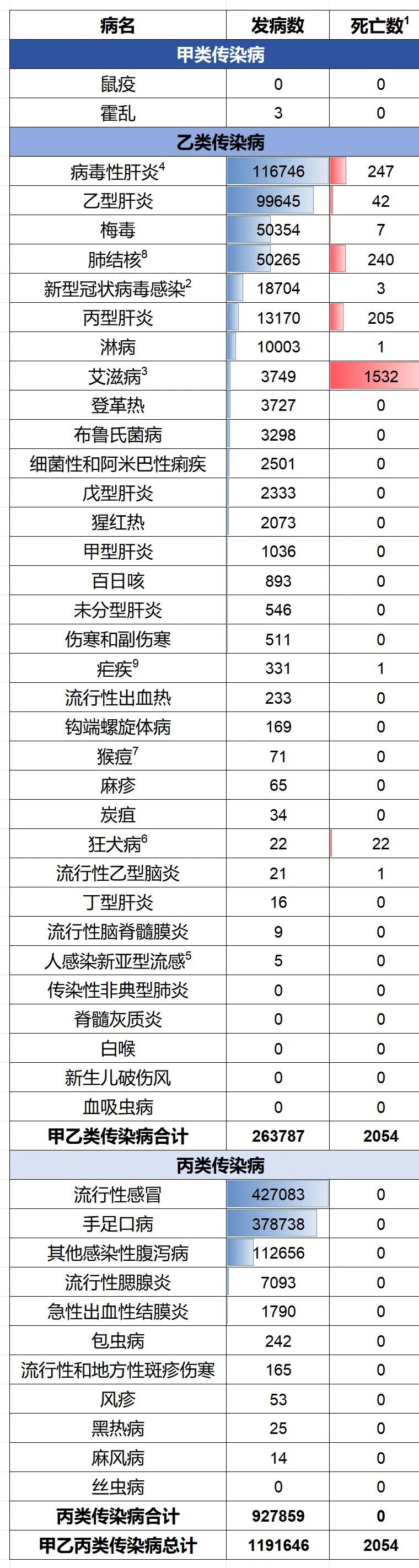 注:发病数与死亡数按照终审日期进行统计。1.通过传染病网络直报系统报告的死亡数据不作为中国传染病死因顺位依据。2.新型冠状病毒感染死亡病例包括新型冠状病毒感染导致呼吸功能衰竭死亡病例和基础疾病合并新型冠状病毒感染死亡病例。3.艾滋病死亡数是累计报告艾滋病病人在当月报告的全死因死亡数。4.病毒性肝炎的发病数、死亡数为甲型肝炎、乙型肝炎、丙型肝炎、丁型肝炎、戊型肝炎、未分型肝炎报告发病数、死亡数的合计。5.人感染新亚型流感包括的病原分型为H3N8、H5N1、H5N6、H7N4、H7N9、H9N2、H10N3、H10N5、H10N8、欧亚禽H1N1,以及发现的其他新亚型流感病毒感染。6.22例狂犬病死亡病例中,13例为当月发病,其余9例为往月发病。7.自2023年9月20日起,猴痘纳入乙类传染病管理。71例猴痘病例包含66例本土病例和5例输入病例。其中,66例本土病例均为Ⅱb亚分支;5例输入病例中,1例为Ib亚分支,4例为Ⅱb亚分支。8.自2019年5月1日起“结核性胸膜炎”归入肺结核分类统计,不再报告到“其他法定管理以及重点监测传染病”中。9.报告的疟疾病例均为输入病例。