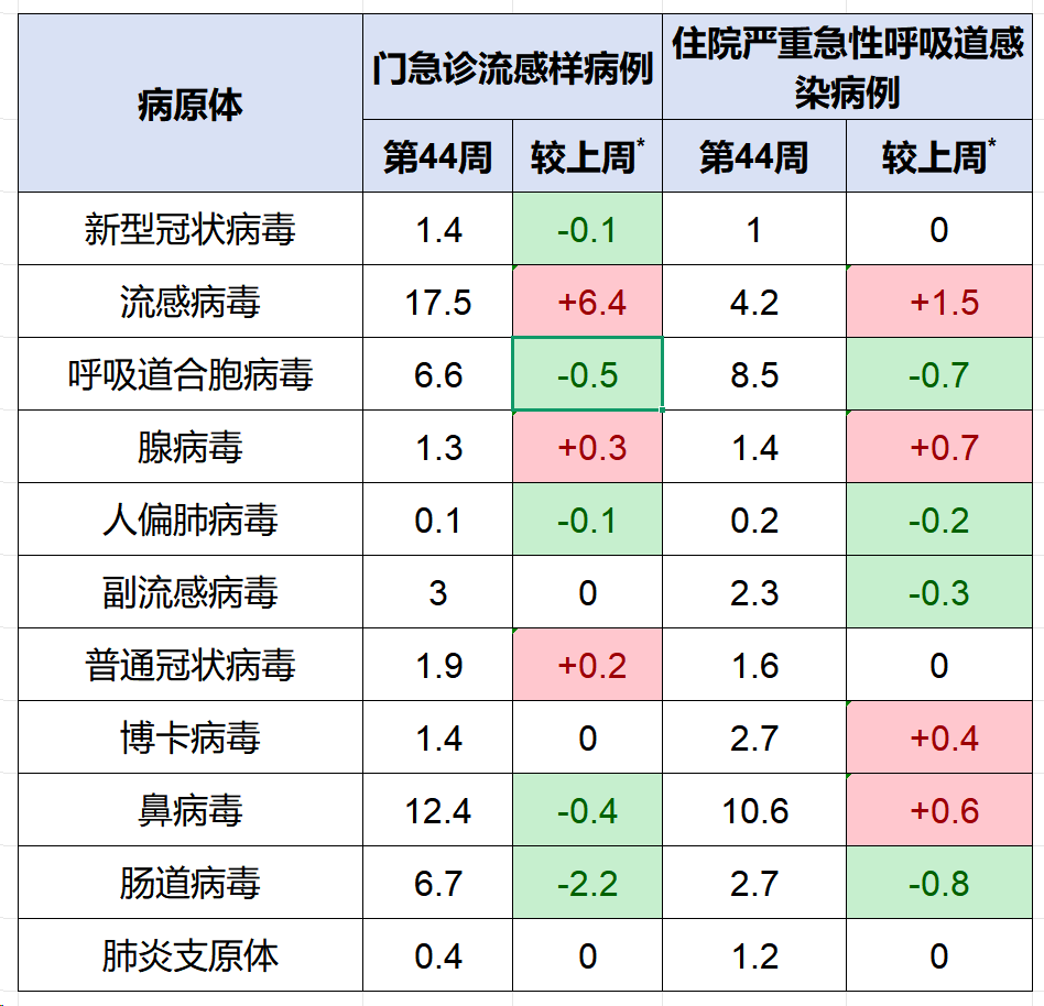 2025年第44周(2025年10月27日—11月2日),全国哨点医院报告的流感样病例数占门急诊就诊总数的比例(流感样病例百分比)为4.7%;