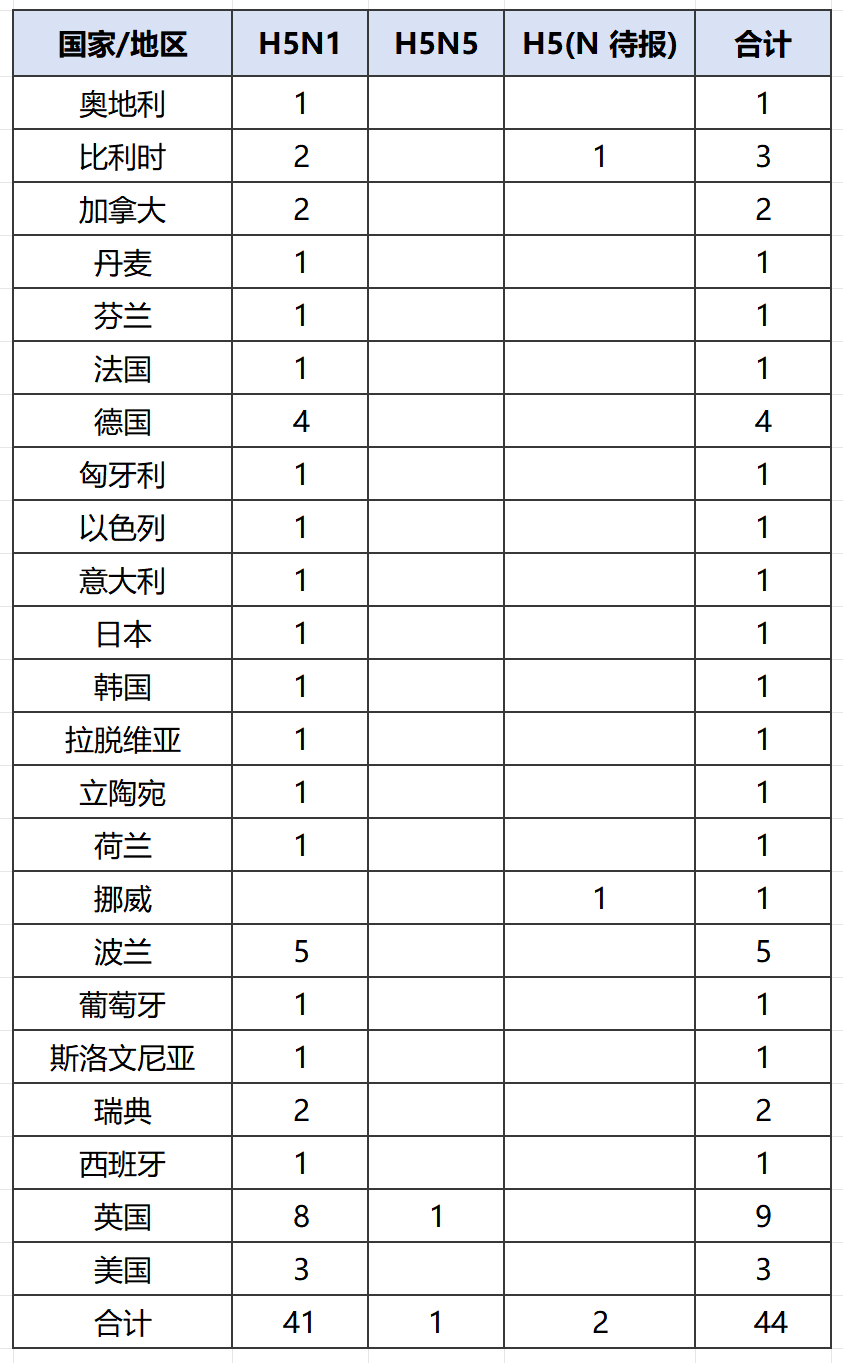 2、2025年10月26日 - 11月1日,世界动物卫生组织共通报 44 起高致病性禽流感动物疫情事件。