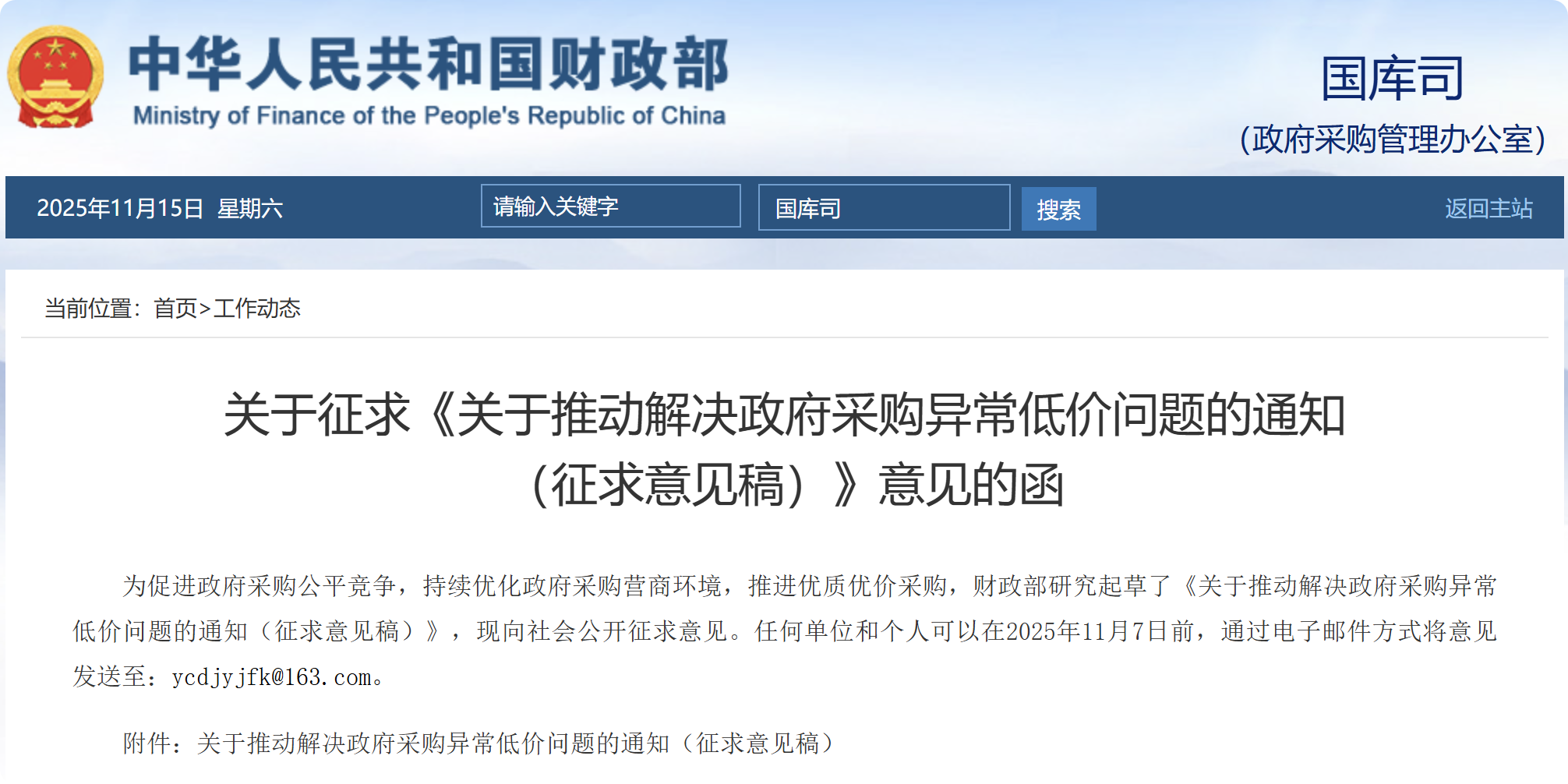 财政部发布《关于推动解决政府采购异常低价问题的通知(征求意见稿)》