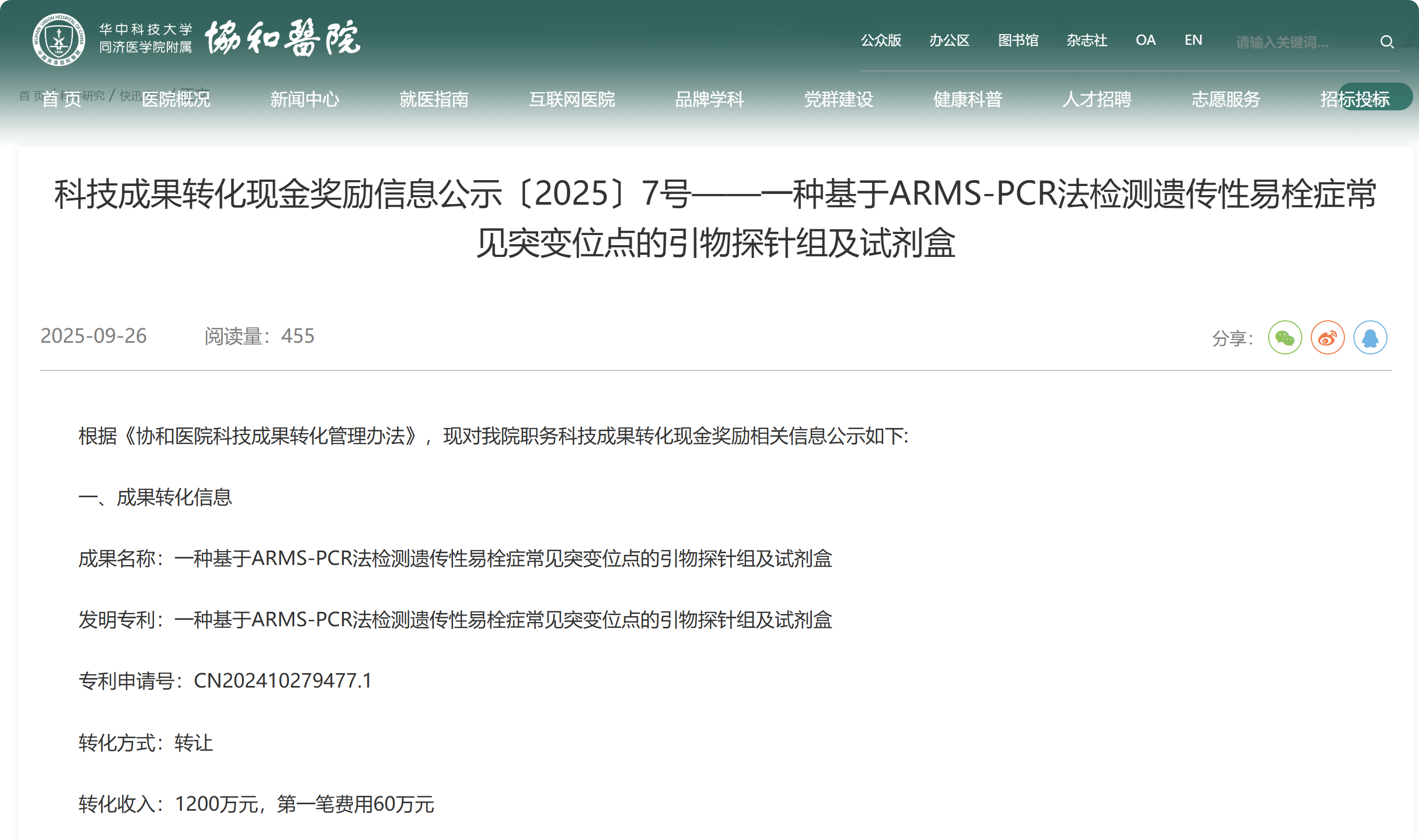 华中科技大学同济医学院附属协和医院胡豫教授团队研发的“一种基于ARMS-PCR法检测遗传性易栓症常见突变位点的引物探针组合及试剂盒”专利成功转让,转化收入达1200万元。该试剂盒属生物检测鉴定技术领域,操作简便,可在医院及检测中心广泛应用,23小时内快速出具报告,适用于遗传性易栓症诊断及临床血栓风险评分补充,较二代测序法具明显临床优势。胡豫教授是我国血液疾病治疗领域代表学者,其牵头项目将我国血栓病分子诊断率从0提升至40%,并在弥散性血管内凝血诊断及CAR-T细胞治疗方面贡献显著,获2018年国家科技进步二等奖。专利成果已转让给第三方实验室。