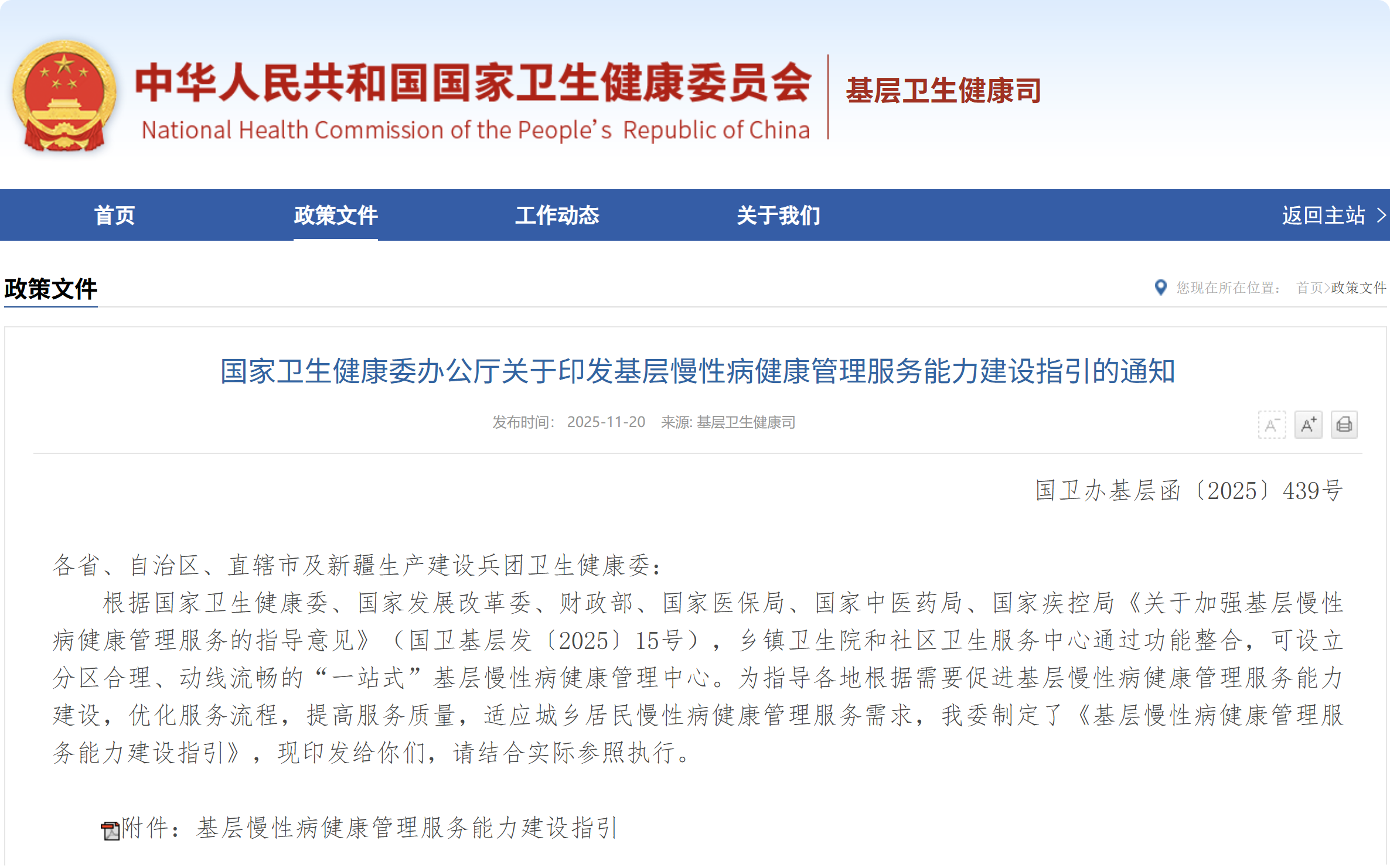 1、国家卫生健康委办公厅关于印发基层慢性病健康管理服务能力建设指引的通知