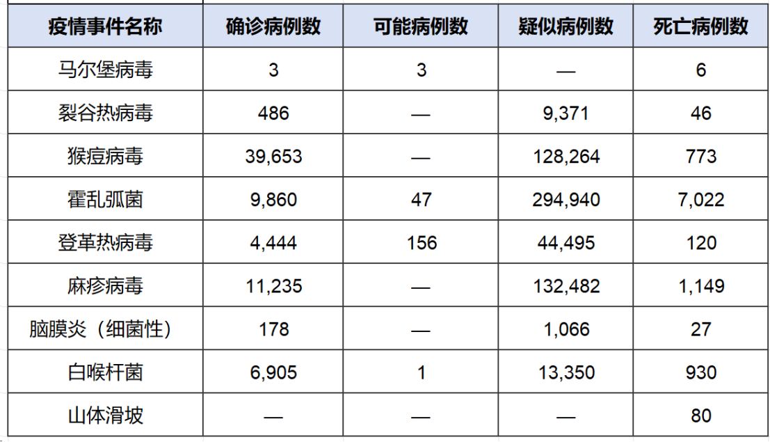 7、非洲猴痘、霍乱、登革热、麻疹、细菌性脑膜炎、裂谷热、白喉等疫情持续中。