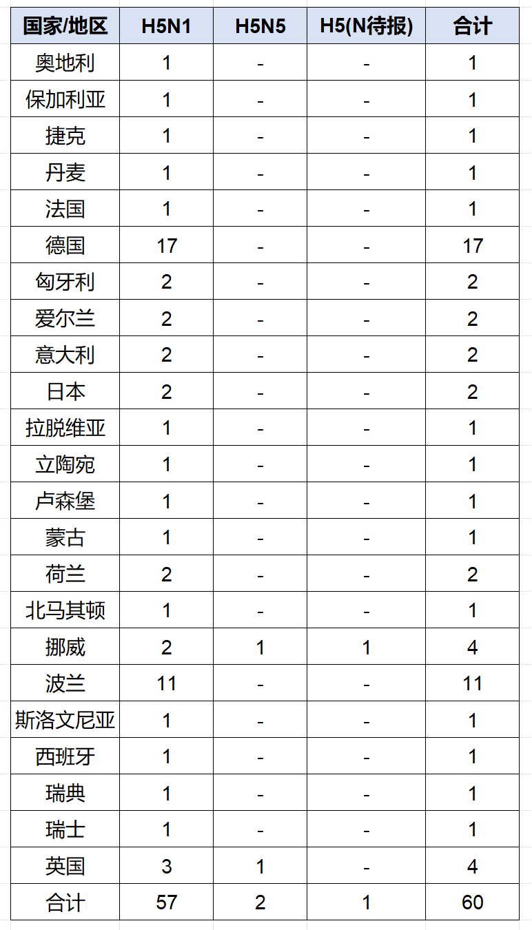 2、2025年11月9-15日,世界动物卫生组织共通报 60 起高致病性禽流感动物疫情事件。