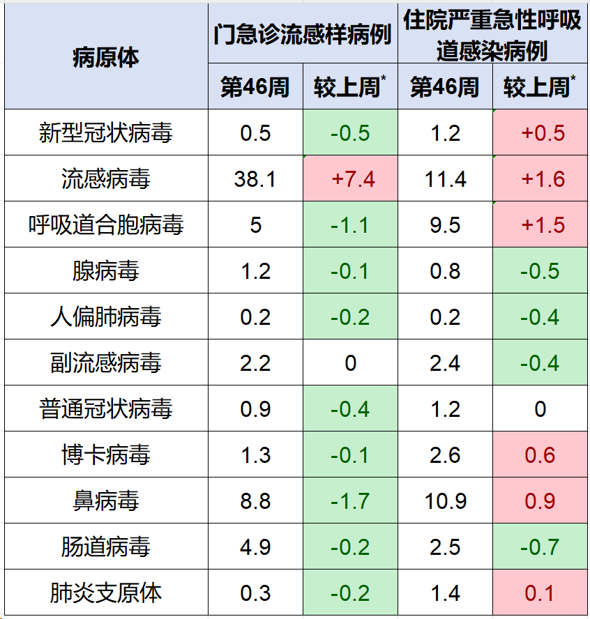 1、46周(2025年11月10日—11月16日),南,北方省份流感活动上升。全国共报告 955 起流感样病例暴发疫情。