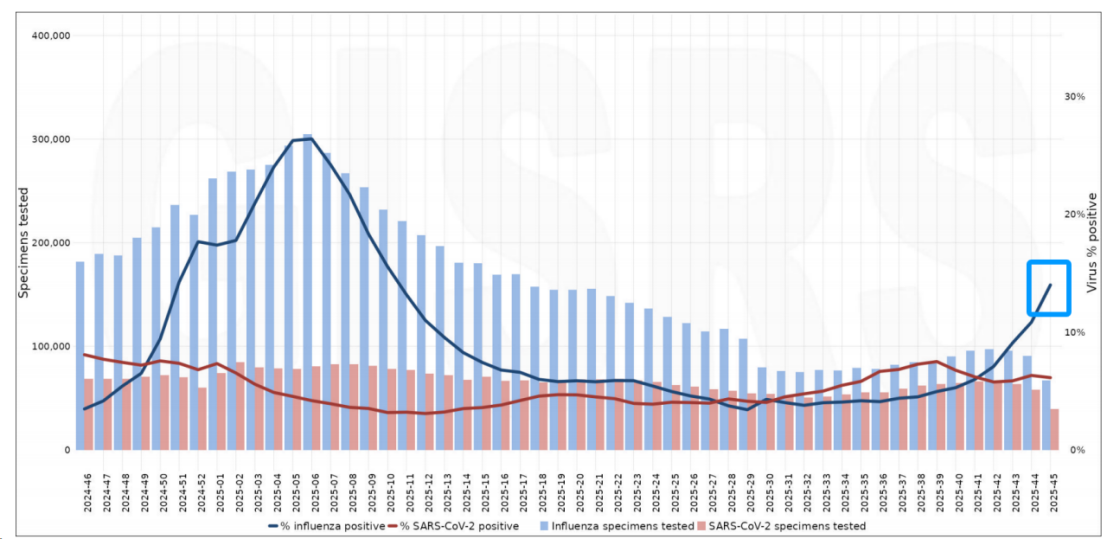 全球范围内,第45周流感活动上升,阳性率超过10%。流感活动持续增加,各地区主要检测到甲型流感病毒。
