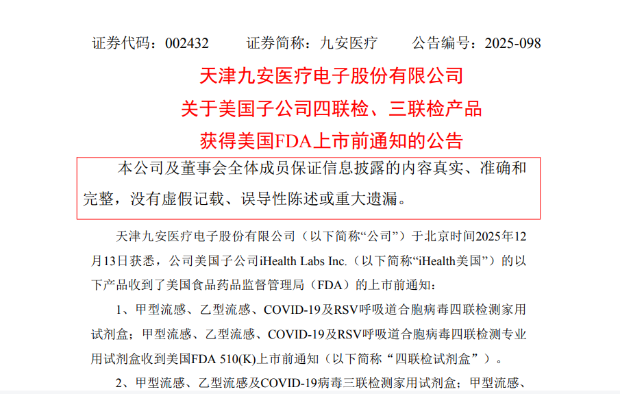 6、九安医疗呼吸道四联、三联检测试剂盒获美国FDA批准上市