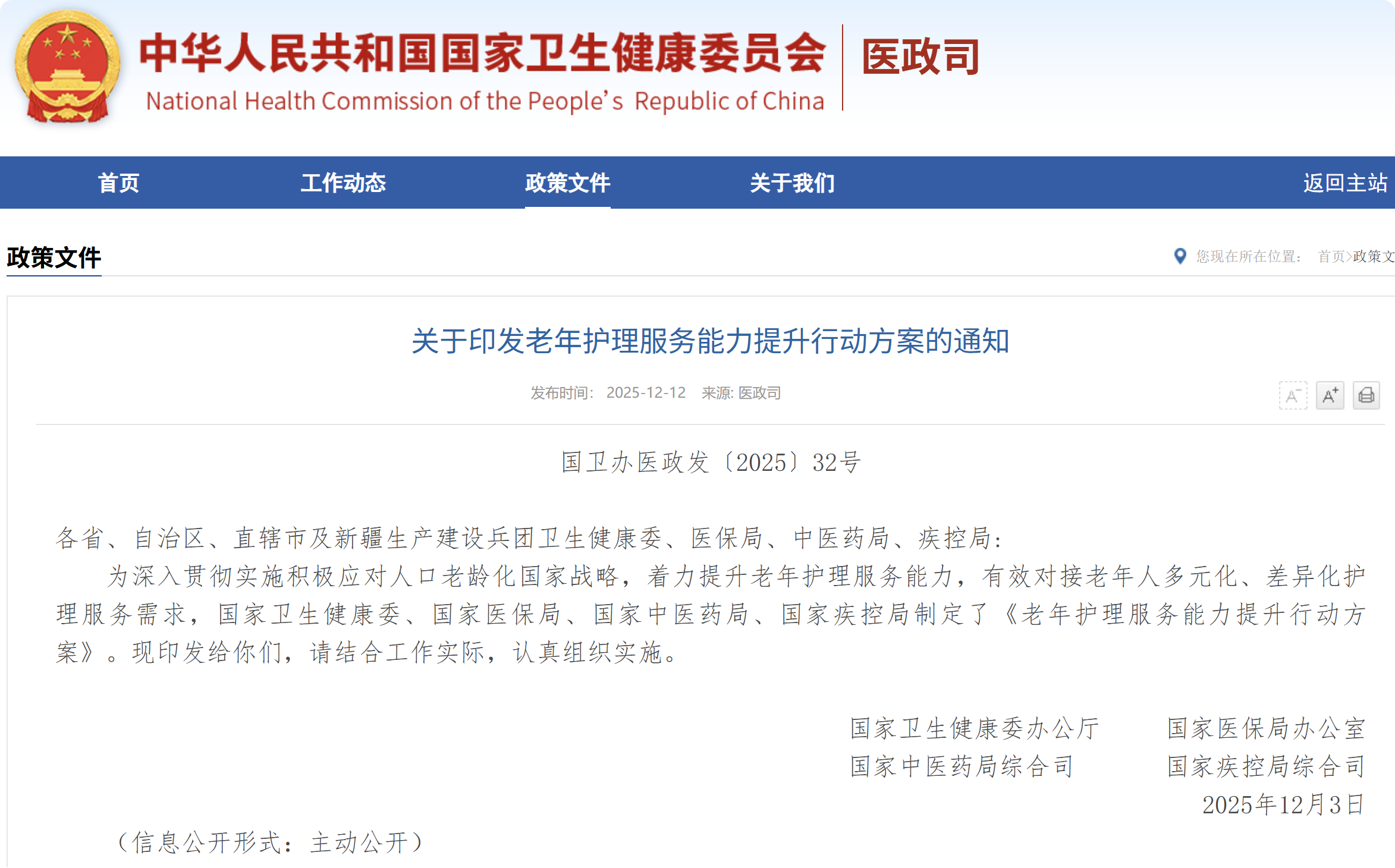 1、国家四部门联合印发《老年护理服务能力提升行动方案》