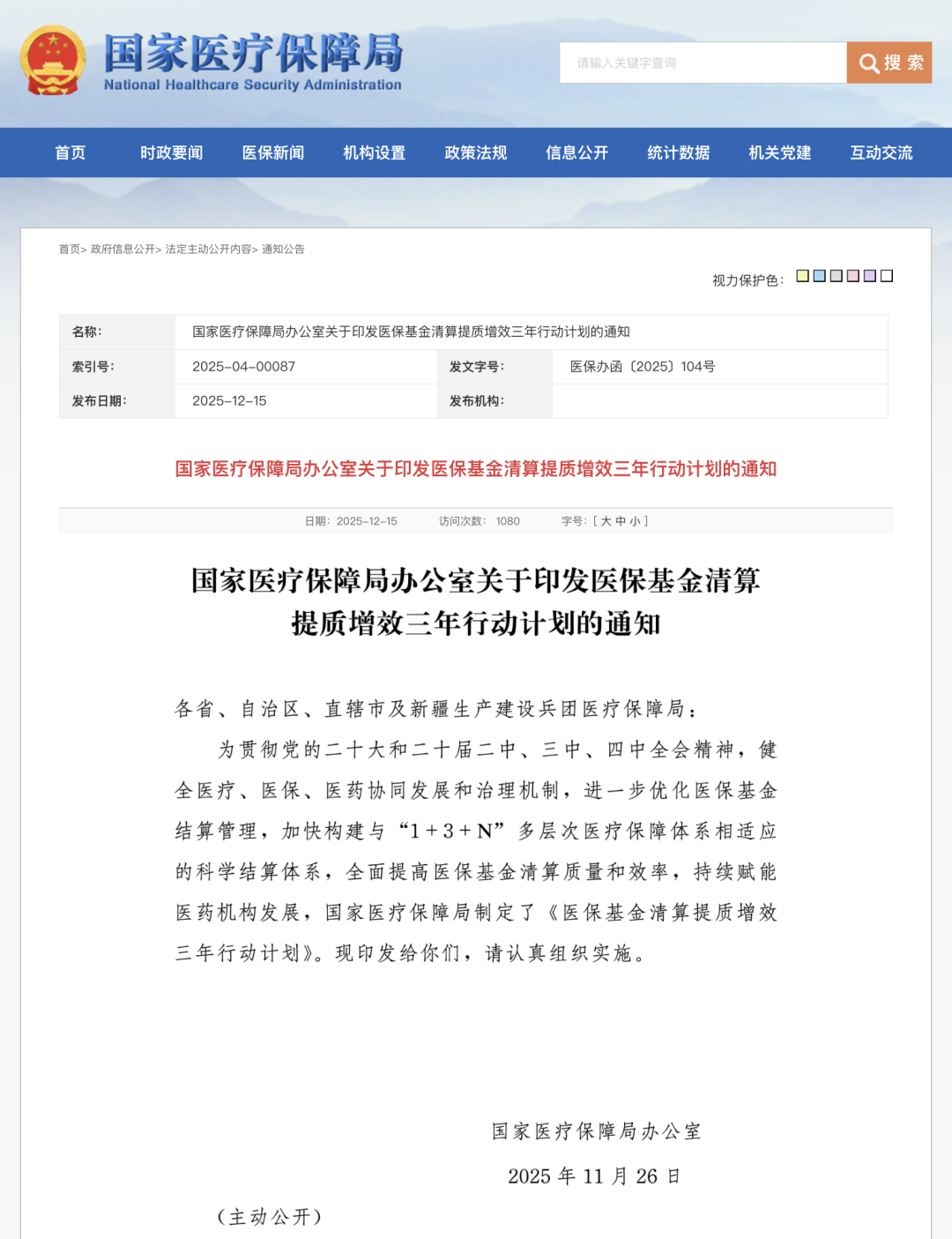 国家四部门联合印发《老年护理服务能力提升行动方案》 四川省要求更新2025年医用耗材最低参考价格 国家医保局:推进医保基金清算提质增效 国家医保局公布2026年重点计划,推进医保改革与发展 上海市政府发布《高端医疗器械全链条发展行动方案》