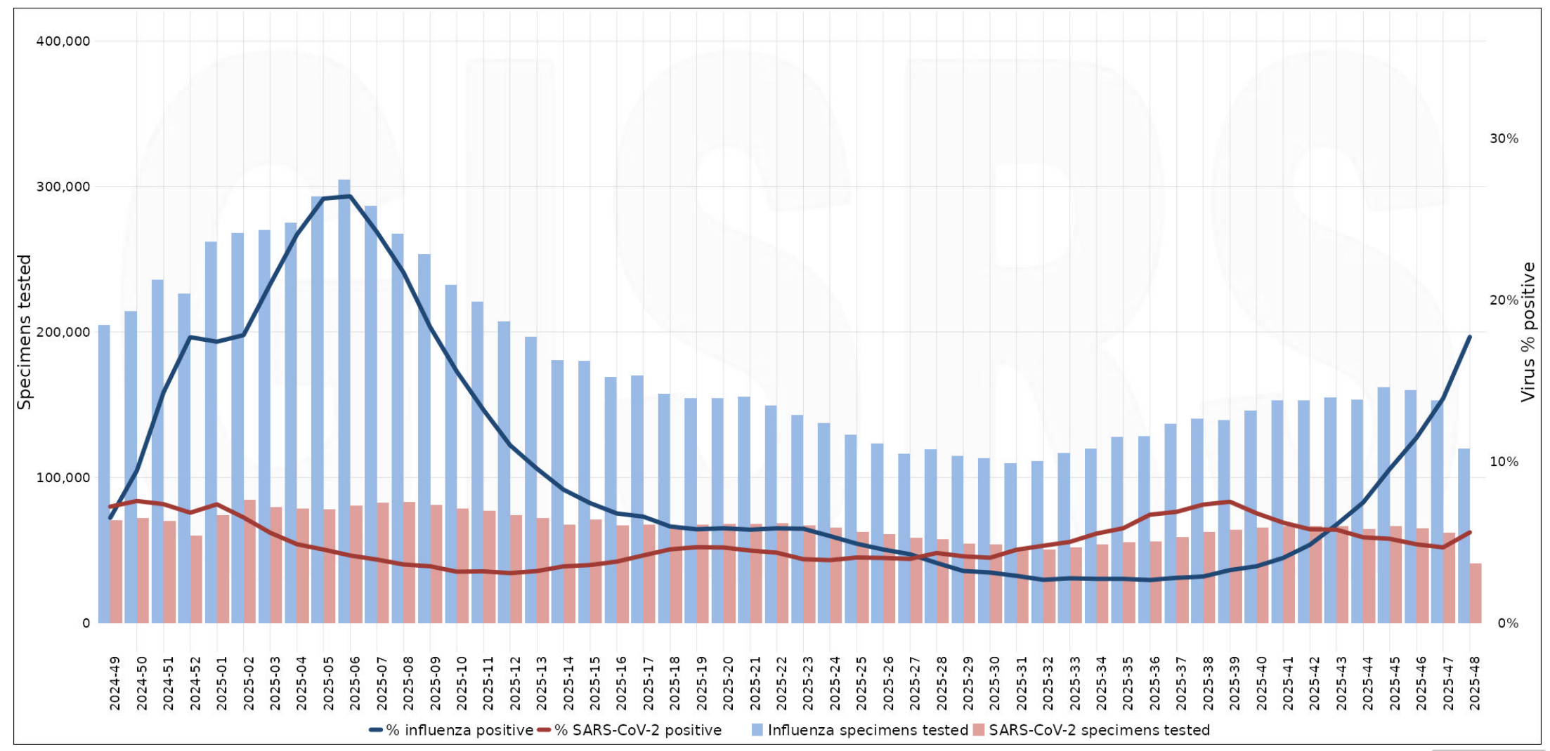 图 全球流感与SARS-CoV-2病毒检测样本周数据及阳性率(过去12个月),蓝色代表流感,红色代表SARS-CoV-2。