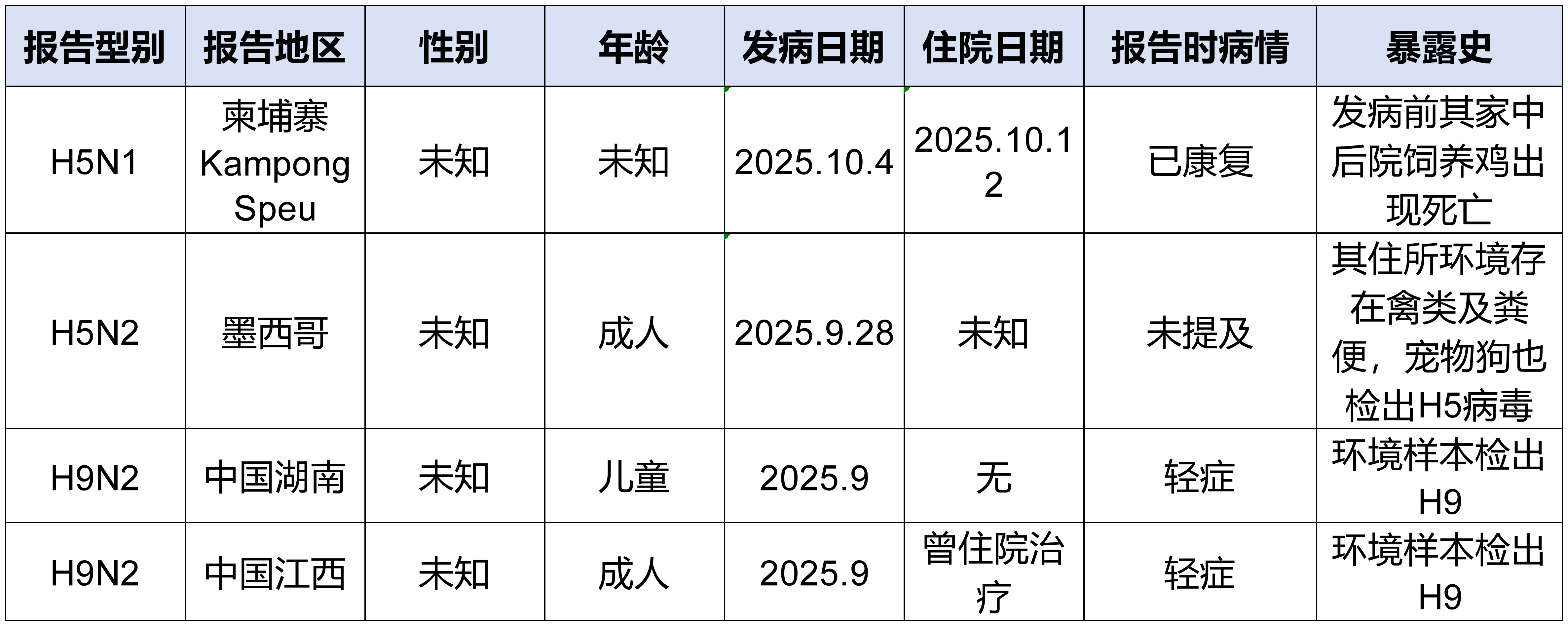 表 2025年9月30日-2025年11月5日WHO通报的人感染动物源性流感病毒病例