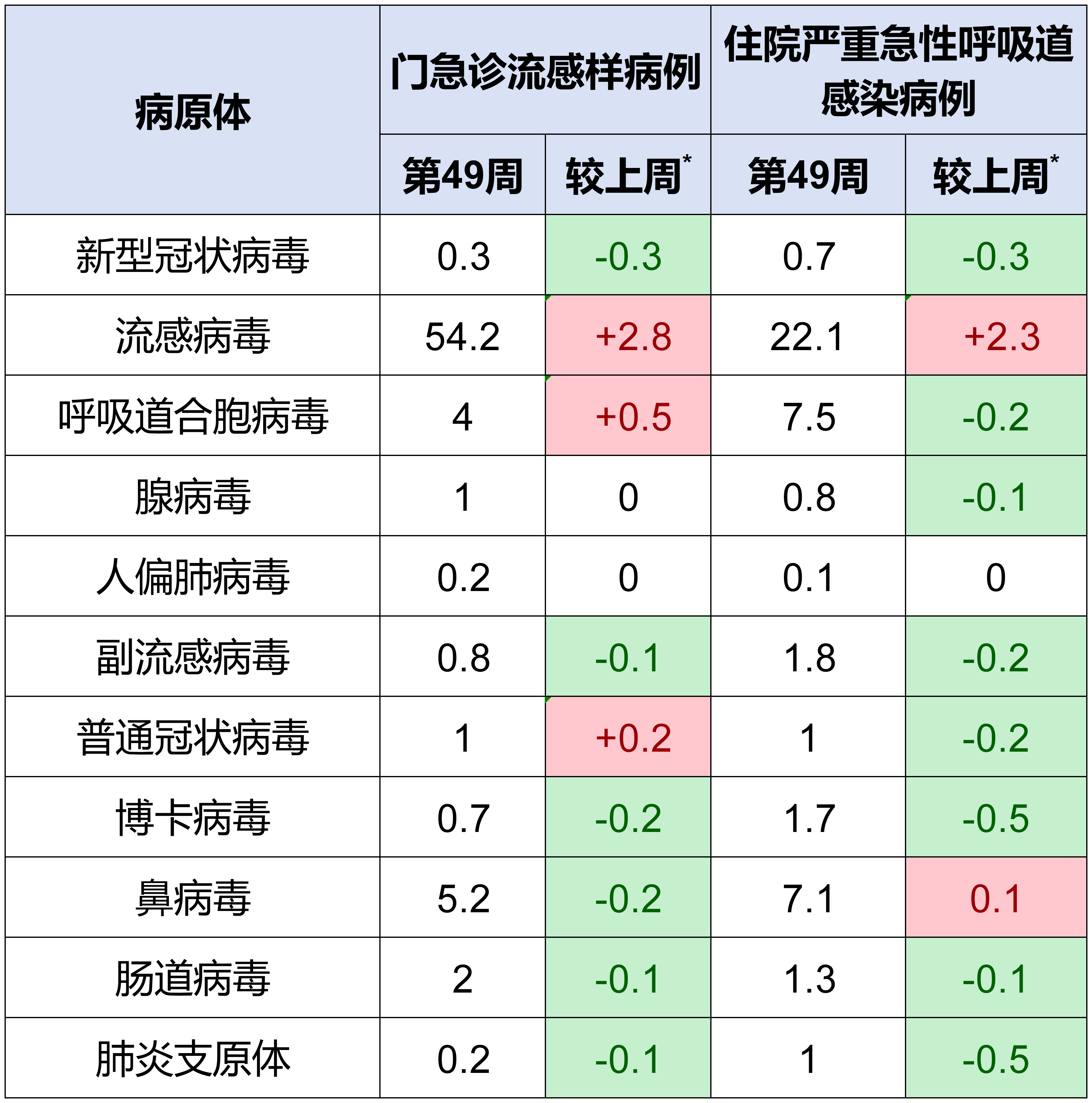 注:“+”表示本周特定病原体检测阳性率数值较上周增加;“-”表示本周特定病原体检测阳性率数值较上周下降。
