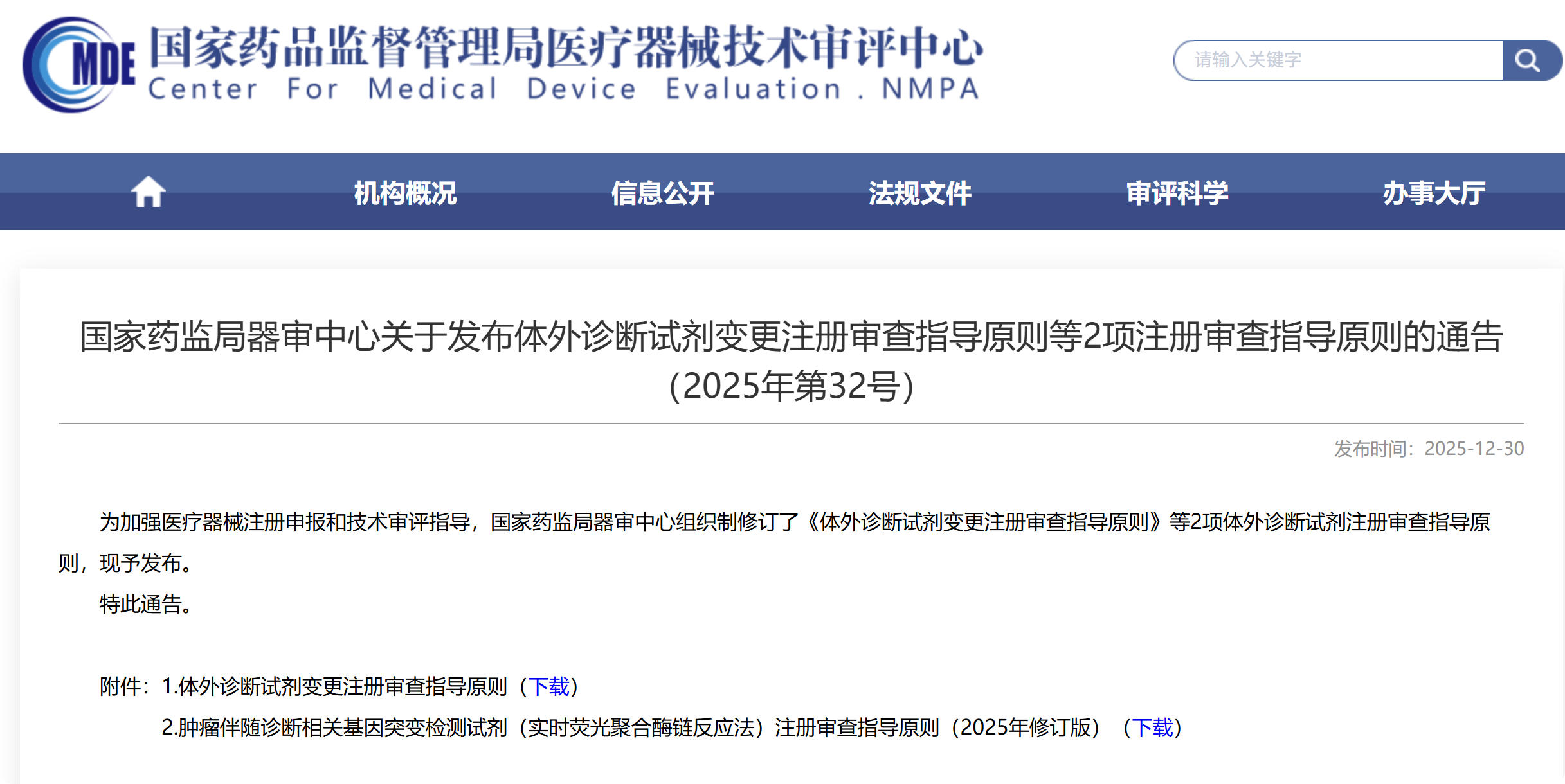 12月30日,国家药监局器审中心发布《关于发布体外诊断试剂变更注册审查指导原则等2项注册审查指导原则的通告》,涵盖《体外诊断试剂变更注册审查指导原则》及《肿瘤伴随诊断相关基因突变检测试剂(实时荧光聚合酶链反应法)注册审查指导原则(2025年修订版)》。新规要求,申报产品若适用不同机型或含不同包装规格,需提交相应性能评估资料。同时,对分析性能研究提出建议,有望扩大IVD行业参与度,为企业提供更多机会。