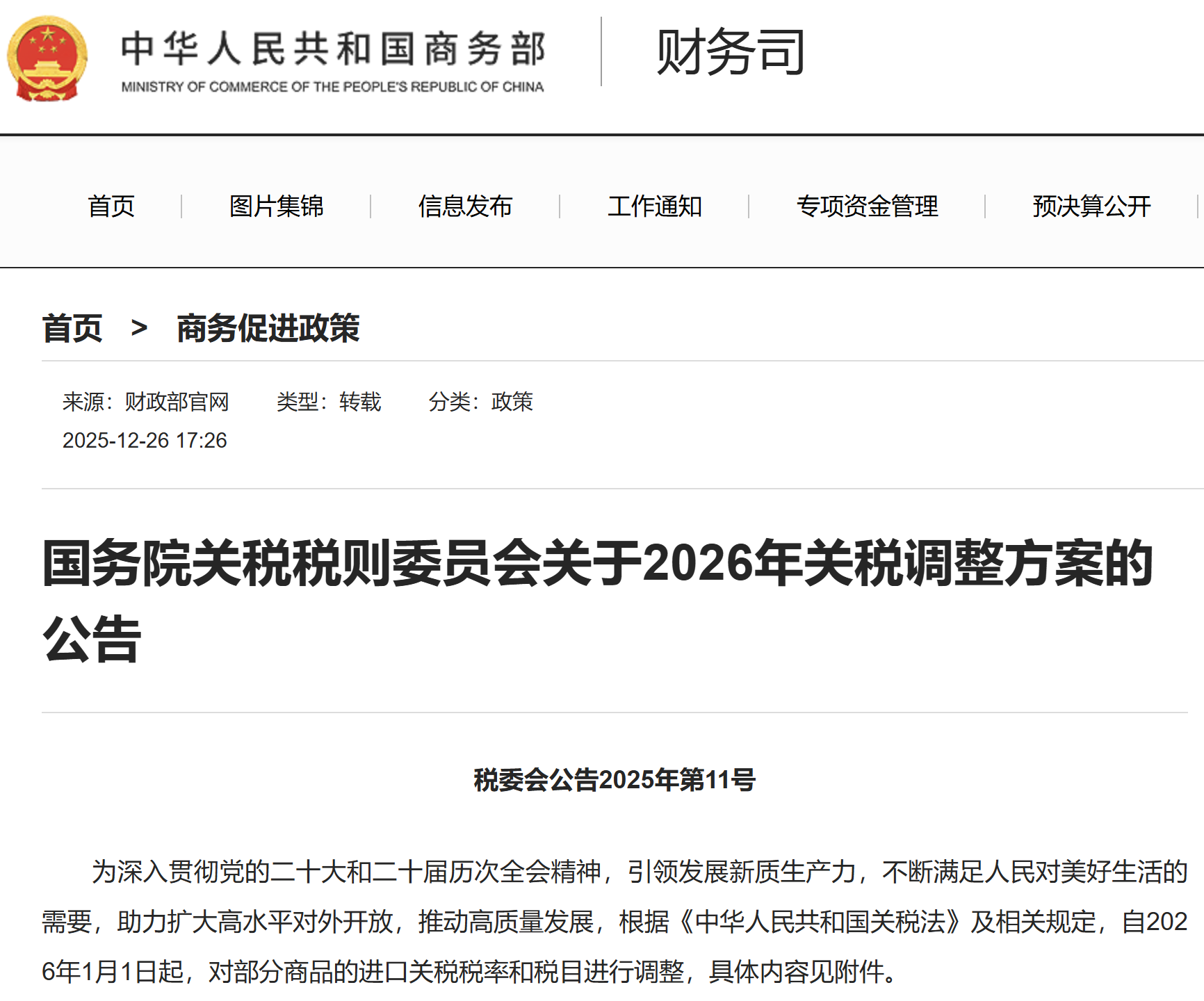 1、国务院关税税则委员会发布《2026年关税调整方案》