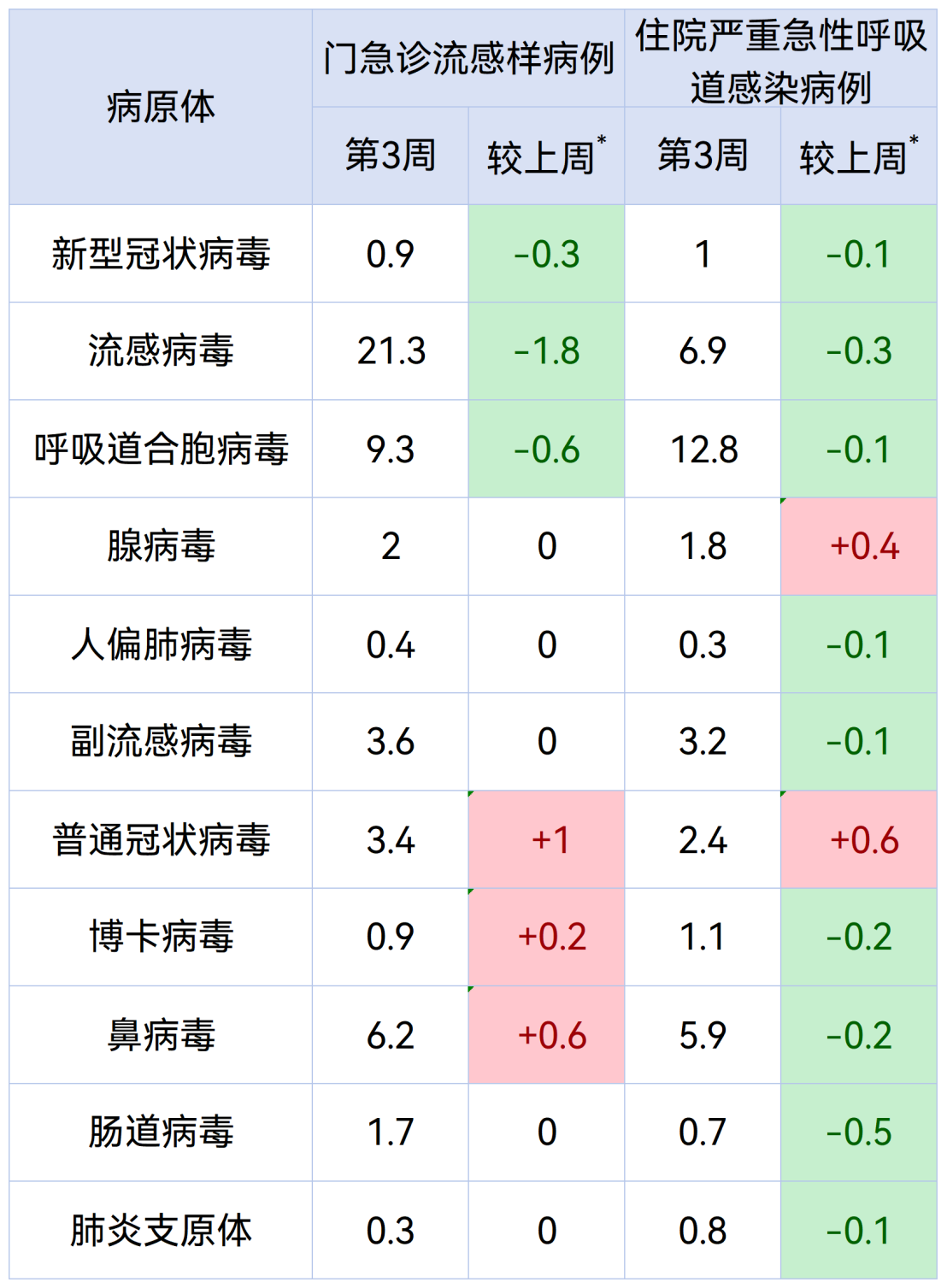 注:“+”表示本周特定病原体检测阳性率数值较上周增加;“-”表示本周特定病原体检测阳性率数值较上周下降。