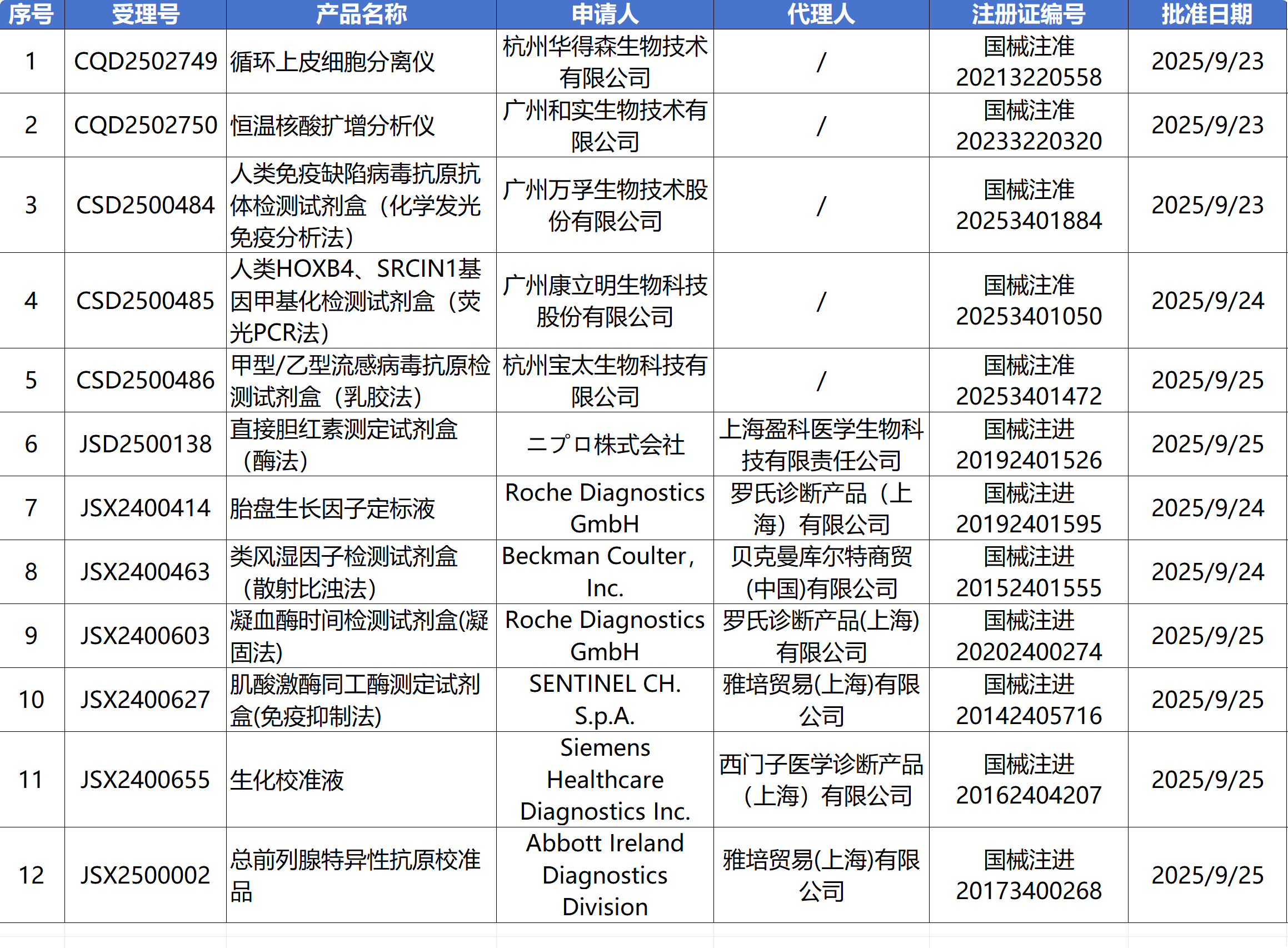 9月26日,国家药监局审批通过了5款医疗器械产品,1款IVD新品获批上市, 12款IVD产品变更注册。
