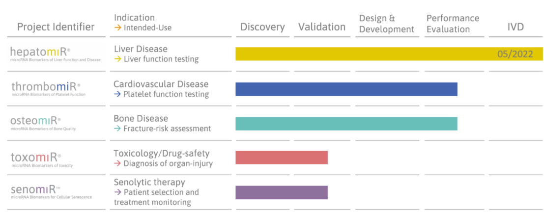 目前,TAmiRNA公司依托miRNA等RNA检测技术,已分别开发了针对肝脏疾病(肝功能评估)、心血管疾病(血小板功能评估)、骨疾病(骨折风险评估)、毒理学/药物安全性(器官损伤诊断)、衰老细胞清除疗法(患者选择与治疗监测)的系列产品,其中hepatomiR肝功能评估产品已获欧盟认证。(图4)