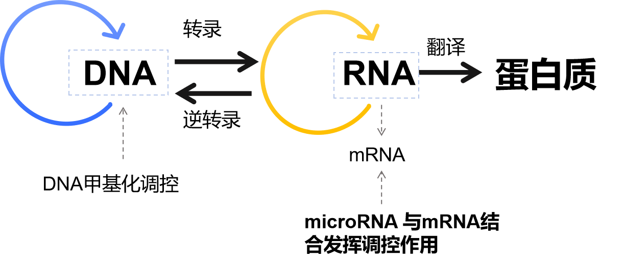 除外经典的中心法则,由基因到蛋白质的这一过程还受到更加复杂的机制调控。上期我们介绍的DNA甲基化是从DNA的水平调控基因表达的核心方式之一,而本期的主角——microRNA,则是通过作用于DNA的转录产物mRNA发挥调控作用。(图1)